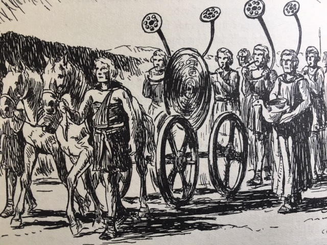 RE: Heidnische Überbleibsel im Berliner Umland - Erato - 18.02.12018 Fürst Orgetor wollt mit einer List den Haag überwinden und den Schmied Egil gefangennehmen. Auch Hinz hielt sich zur selben Zeit im Haag auf. So hatte Orgetor die Möglichkeit, sich zu rächen. Orgetors Pläne wurden jedoch von dem Wolf, Wulfhard dem Grauen, belauscht. Er ist der Waffenmeister des Elbgermanen Hinz und berichtet seinem Herzog von dem bevorstehenden Überfall. Gut vorbereitet schlagen sie die Kelten zurück, und Orgetor wird von Hinz getötet. Zitat:Der Schmied ließ nun die Toten auf großen Scheiterhaufen verbrennen und ihre Asche in Urnen in die Erde graben. Darüber wurden die Totenhügel gewölbt. Anmerkung: Das einfache Volk wurde also nicht in großen Steinkistengräbern und auch nicht unter großen Hügeln bestattet. Hügelgräberfelder weisen auf den Bestattungsbereich des gemeinen Volkes hin. Der Schmied trieb mit allen Völkern Handel. Vor dem misslungenem Überfall hatten auch Orgetor und Egil Handel betrieben: Zitat:Den Kaufpreis, den er dem keltischen Fürsten für das Metall in Bernstein gezahlt hatte, nahm er nicht wieder zurück, sondern weihte ihn der Gottheit. Im feierlichen Zuge ward das große Tongefäß, in dem der kostbare Schatz geborgen war, hinaus zur heiligen Stätte, einem Moor, getragen und dort niedergelegt und mit Steinen bedeckt. Anmerkung: Ein schöner Hinweis auf ein Heiligtum, die Art und wie Opfer dargeboten wurden. Die Tat des Riesen beschreibt eine ehrenhafte und richtige ausgleichende Verhaltensweise. RE: Heidnische Überbleibsel im Berliner Umland - Erato - 18.02.12018 Wir finden in der überlieferten Sage einen Hinweis auf eine Orakelstätte. Vielleicht das Delphi von Germanien? Zitat:... Dort, wo die Havel in die Elbe mündet, steht in einem heiligen Hain uralter Bäume der Hof der Seherin der Elbe. Sie wird von allen Germanenstämmen verehrt, und es war Sitte, ihren Rat und ihre Weissagung vor jedem Kriegszug oder einer gewagten Fahrt einzuholen. So ritt auch Hinz zu dieser Seherin ... Hinz will Egil und Schwanhild befreien, die in den Händen der Parisianer gefangengehalten werden. Die Seherin antwortet auf die Frage nach dem Ausgang der Fahrt: Zitat:Nicht gut ist, die Zukunft zu Wissen, zag wird der Mann, wenn Böses ihm droht, nicht gerne frag ich die Nornen. Hinz antwortet: Zitat:Nicht gut ist zu wissen dem zagen Mann, was Skuld, die Norne der Zukunft ihm wirkt. Aber den mutigen Mann, der das Kommende kennt, schreckt Skuld die Norne nicht. Mir zagt nicht das Herz, wenn Todesrunen du wirfst. Zukunft begehr ich zu wissen, erfüllen will ich den Wahrspruch der Norne. Anmerkung: Ein Mann dieses Zeitalters hat keine Angst vor dem Tod. Er war Teil des Kreislaufes des ewigen Lebens. Zitat:Feierlich schritt die Seherin dem Herzog voraus, tief in den heiligen Wald hinein, dort wo eine Quelle aus dem Mutterschoß der Erde entsprang und im munteren Lauf zur Elbe herabstrebte. Geheimnisvoll woben die Strahlen der scheidenden Sonne goldene Fäden zwischen den grünen Blättern der Buchen. Auf der Suche nach der Mündung der Havel und dem vermuteten Orakel fand ich folgenden Hinweis: Zitat:Bleis recherchierte und zeichnete den Verlauf der Elbe vor rund 1.000 Jahren nach, als sie demnach im Flussbett der heutigen Havel die Rathenower Vorgängersiedlungen berührte. Die Havel wäre demnach in slawischer Zeit schon bei Milow in die Elbe gemündet. Dass sich die Lage vor rund 2.000 Jahren ebenso dargestellt haben mag, dürfte als sehr wahrscheinlich gelten. Dadurch wären die Flächen, die heute Rathenow bilden, zur Zeitenwende römisch-germanisches Grenzgebiet gewesen. ... und wieder treffe ich auf Frau Harke: Zitat:Indes war Drusus bis an die Elbe weiter marschiert. Historikern zufolge habe er im Bereich des heutigen Magdeburg kehrt gemacht. Der Grund dafür soll eine "übergroße Frauengestalt" gewesen sein, die Drusus erschien und ihm Unheilvolles prophezeihte. Offenbar handelte es sich um eine Frau von Respekt einflößendem Wuchs. Gab es solche Germaninnen wirklich? Zumindest weiß die Geschichte von einer Seherin der Semnonen, die Ganna hieß, aber erst einige Jahrzehnte nach Drusus gelebt hat und auch nicht als riesenhaft beschrieben wurde. Dass es die Riesin Frau Harke, mythische Schutzpatronin der Elb-Havel-Region, gewesen sein könnte, die den römischen Feldherren zur Umkehr bewog, dürfte als sehr unwahrscheinlich gelten. Quelle: https://www.moz.de/artikel-ansicht/dg/0/1/1406464/ RE: Heidnische Überbleibsel im Berliner Umland - Erato - 19.02.12018 Das Heiligtum der Westgermanen wird im Buch von Pastenaci als die bekannten Externsteine erwähnt. Zur Sommersonnenwende ist Hinz mit Sigurd und seinem Heer bei der alljährlichen Zeremonie anwesend: Zitat:Im Osten begann der Himmel sich sanft zu röten. Jetzt erschien, nur dem hoch auf dem Felsen in einem in den harten Stein gegrabenen Raum stehenden Priester sichtbar, der goldene Rand der Sonne im Nordosten über dem Horizont. Im gleichen Augenblick richtete der Priester eine goldene Sonnenscheibe, die an einer langen Bronzestange befestigt war, empor. Bild: Werner Chomton Zitat:Im Rhythmus der einfachen Musik stiegen die Männer in Gruppen geordnet die Berge hinauf und wanderten herüber zur Ebene, die heute Senne heißt. Dort füllten schon Tausende und aber Tausende, Männer, Frauen und Kinder das große Rund einer Rennbahn, in der nun fröhliche Kampfspiele der jungen Mannschaft begannen. Den Höhepunkt des Festets bildete der feierliche Einzug der Edelsten des Volkes, die auf Rennwagen stehend in die Bahn einfuhren. Die Senne befindet sich westlich der Externsteine. Der symbolische Sonnenwagen fuhr bei diesem Einmarsch voran, und im Anschluss wurden Wagenrennen veranstaltet. Nach Schmaus und weiteren Wettspielen wurde der Zug erneut in Bewegung gesetzt. Diesmal versammelten sich Priester und Gefolge auf einem Berg. Mitten in einem Steinkreis wurde ein Feuer entzündet: Zitat:... auf dem in eine riesigen Steink