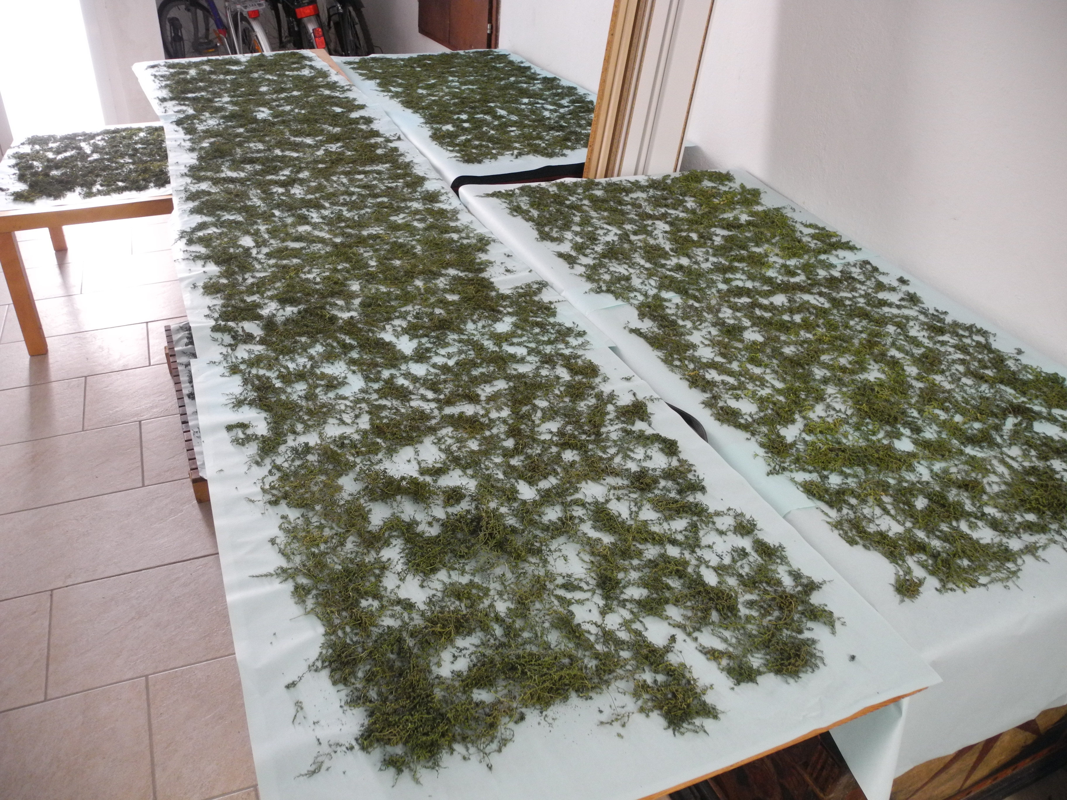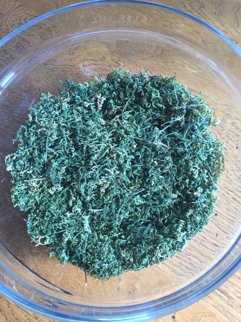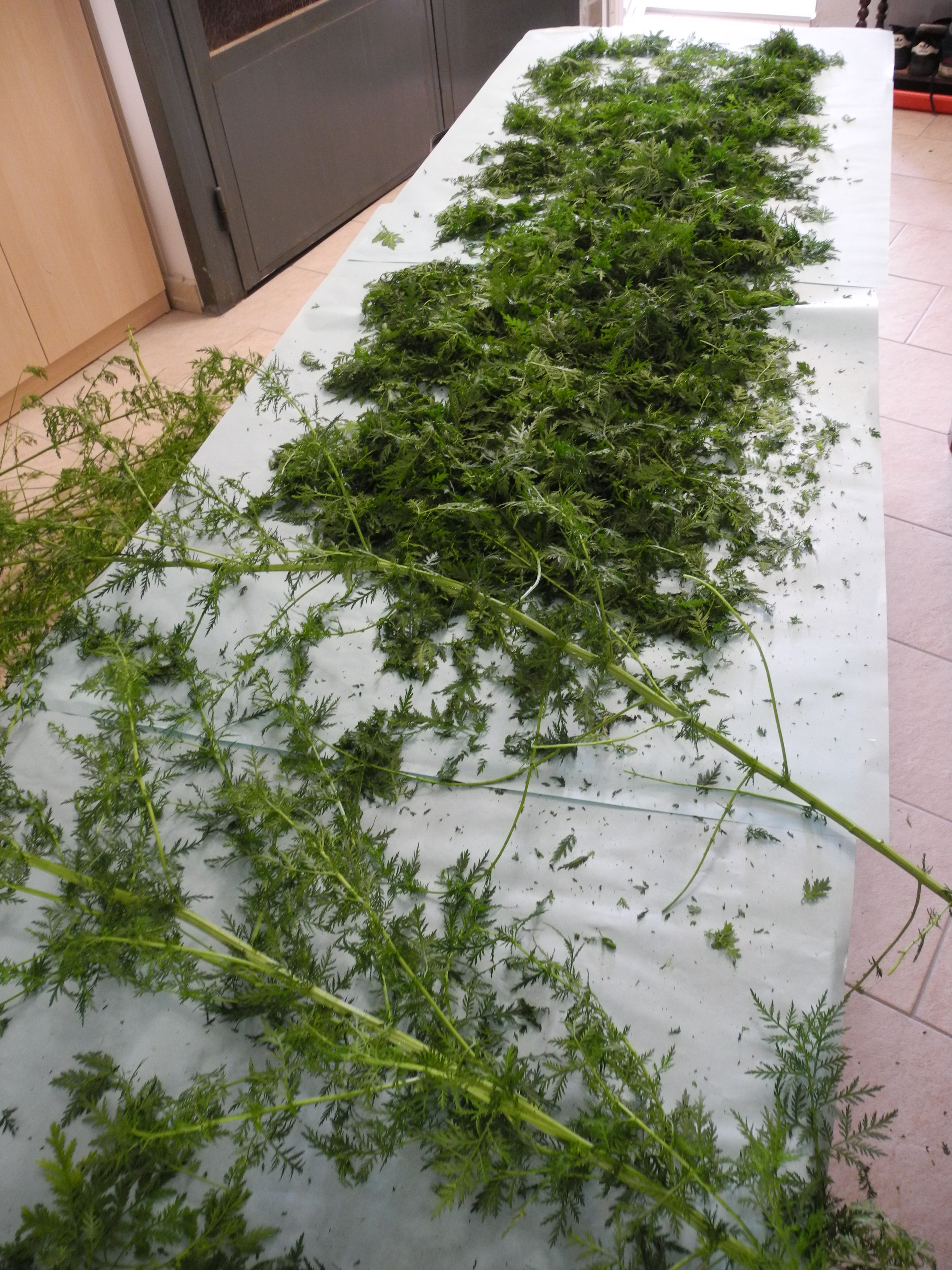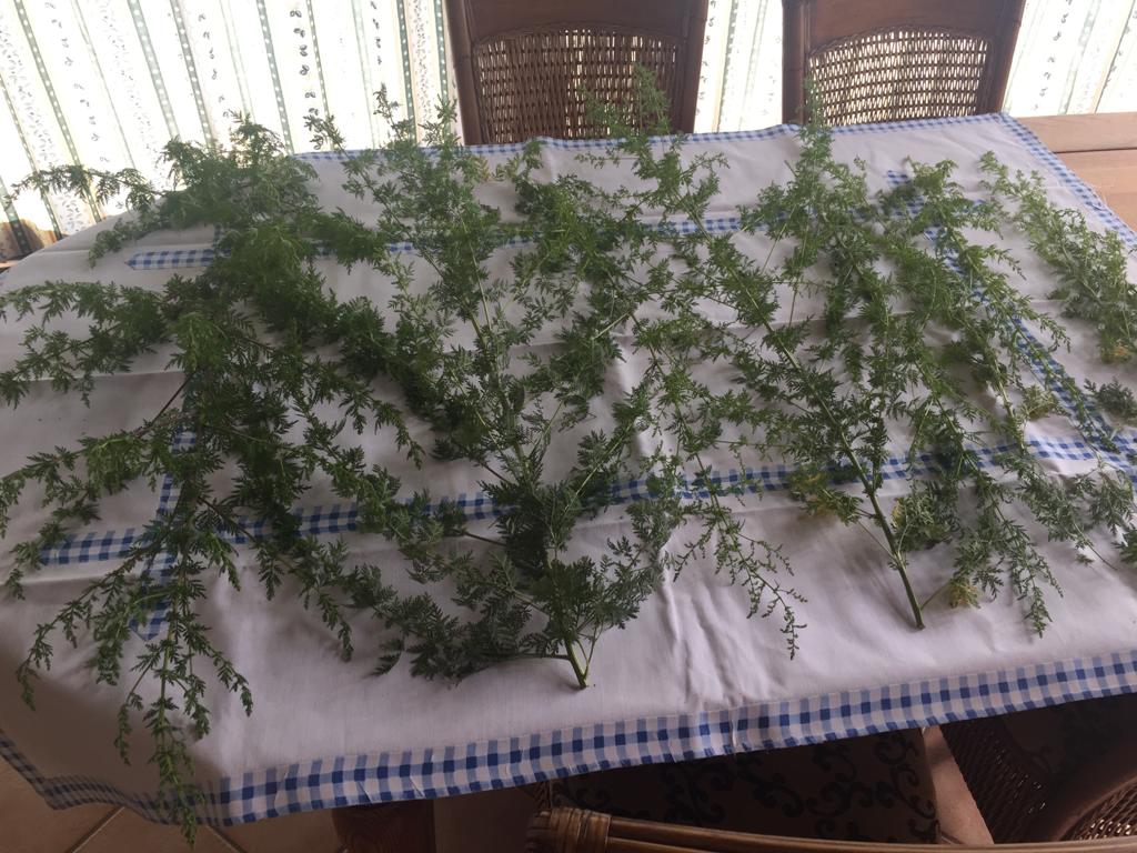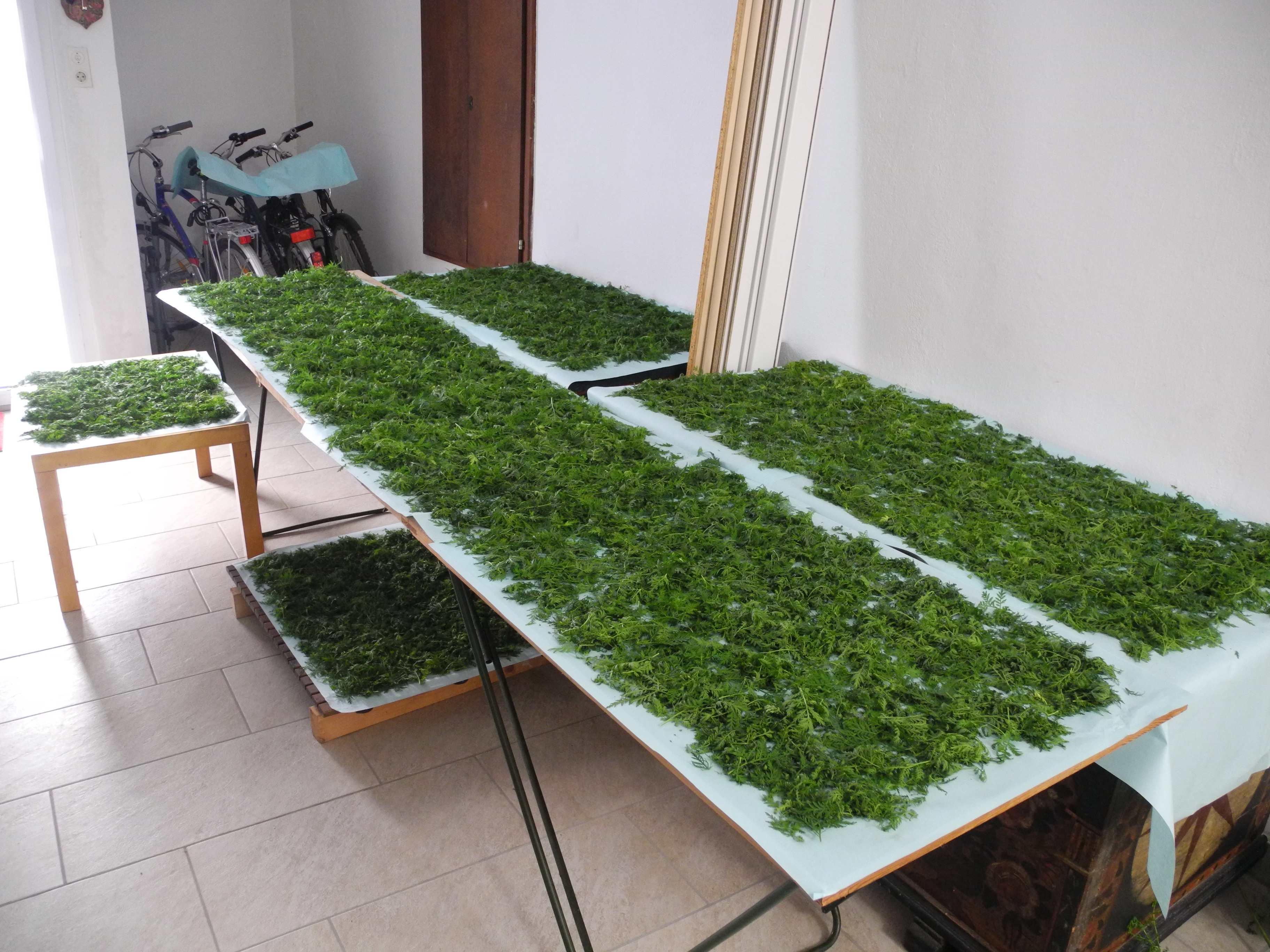 RE: Einjähriger Beifuß - Sirona - 12.09.12020 Ernte der Artemisia annua Es ist soweit, meine erste Ernte der Artemisia annua. Meine 11 Artemisia-annua-Pflanzen im Beet waren jetzt ungefähr 1,40 m hoch, und ich sah schon, dass sich Blüten entwickelten. Deswegen wurde vor ein paar Tagen geerntet. Die Artemisia annua in den Töpfen war ungefähr 80 cm hoch und auch schon reif für die Ernte. Auch hier waren es 11 Pflanzen. Die gesamte Ernte Blätter von den Stängeln entfernen Die gesamte Ernte beim Trocknen - in einem gut durchlüfteten Raum. Bin gespannt, wieviel Gramm die Blätter in getrockneten Zustand ergeben! Mein Fazit: Den meisten Ernteertrag hatte ich in einem gut vorbereiteten Beet. Die Pflanzen, die in Töpfe im Freien standen, werden zwar etwas größer, aber nichts im Vergleich zu denen in den Beeten. Die Pflanzen, die ich drinnen habe, haben sich nur um ungefähr 5 cm weiterentwickelt. RE: Einjähriger Beifuß - Yule - 15.09.12020 Wenn die Blühzeit gekommen ist, steckt die Artemisia annua alle Kraft in die Blüte – seht selbst, was dann passiert: Links sind schon die hellgrünen Blütenknospen zu erkennen. Die Blätter verlieren an grüner Blattfarbe, die Spitzen rollen sich leicht ein, das Blatt wird zum Stängel hin aufgerichtet. (Im Laufe der Blühzeit sollen sich die Blätter sogar ganz zurückbilden.) Rechts im Bild ist eine Pflanze, die aus dem gleichen Samen zeitgleich gesät wurde. Da sie etwas schattiger steht, hat sie noch keine Anzeichen von ersten Blütenknospen. Ihre Blätter haben ein sattes Grün und sind weit und offen ausgestreckt. Im Samen befindet sich ebenfalls der Wirkstoff Artemisinin, und er kann auch als Tee verwendet werden. Pollenallergiker sollten sich jedoch langsam „herantasten“, da v. a. die Blüten eine Beifuß-Allergie auslösen können. Wir werden aus einzelnen Pflanzen Samen für das nächste Jahr gewinnen. Unsere restlichen Pflanzen werden wir bei den allerersten Anzeichen von Blütenknospen vollständig abernten, um möglichst viel Teekraut trocknen zu können. RE: Einjähriger Beifuß - Munin - 16.09.12020 Ich glaube die Pflanzen wachsen am besten direkt im Boden, und nur die Anzucht im Topf ergibt wirklich Sinn. Meine Pflanzen scheinen einen Wachstums-Stopp zu haben, obwohl es ein großer, tiefer Blumentopf ist. Ich verstehe das aber, ich würde auch lieber direkt in der Erde wurzeln. ![]() Violetta: Das ist auch unsere Erfahrung. RE: Einjähriger Beifuß - verdandi - 16.09.12020 Meine waren in einem großen Topf und sind so groß wie ich, was für einen Menschen nicht viel, für eine Pflanze jedoch ganz ordentlich ist.
