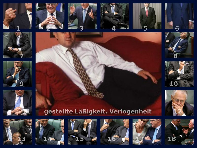 Körpersprache in Bildern - Paganlord - 31.08.12017 Trump: Waffen sind geladen und entsichert Trumps derzeitige Kriegshysterie hat mehrere Hintergründe. Ob es jedoch zum angekündigten (und durch die USA angestrebten) Nuklearkrieg kommt, bleibt momentan zu bezweifeln. Trumps Politik-Aktionen richten sich hauptsächlich nach seinen Geschäftsstrategien und nach den Befehlen seiner grauen Vordenker. Was kein "Geschäft" verspricht, das wird reduziert oder ausgeschaltet. Kriege sind in seinen Augen ein Erfordernis, um das Einkommen (sei es privat oder Staat) zu sichern. Trump bezeichnet seine jüngsten Äußerungen zur KDVR (Nordkorea) als möglicherweise nicht scharf genug. Er empfahl dem Land, besser sehr nervös zu sein. Und er erwartet, daß China "sein" Problem löst. Trump ist ein gutes Beispiel für graue Spielregeln. Drohe und siege, egal welchen Preis der Rest der Welt dafür zahlen muß. Daß der gesamte Planet von solcher Arroganz betroffen ist, kann sich jeder selbst ausmalen. Trumps Aktionen sind leicht an seiner Körpersprache ablesbar. Alle benutzten Zeichen haben jedoch eine zusätzliche okkulte und schwarz-magische Bedeutung. Seine Handgesten und Mimiken zeigen uns die Richtung seiner Strategien auf. Zeigefinger > Bild: 1, 3, 4, 5, 7 = Hinweis, Befehl, Markierung, Drohung, Diktatur. Man benutzt den erhoben Zeigefinger auch immer dann, wenn gewisse telepathischen Suggestionen ausgesendet werden sollen. So daß die sich im Raum befindenden wichtigen Personen nur das hören, was sie hören "müssen" > ohne das zu hören, was gesagt wurde. Auch Visionen werden auf diese Art in den Raum entlassen und den Gehirnen der Zuhörer eingeprägt. Der Zeigefinger ist das telepathische Zwangsmittel des unsichtbaren und unhörbaren Subliminalauftrags. Wie ein Hammer hämmert er den Befehl auf die Festplatte des Zuhörers. 2 – soll zwar hier bei Trump die Wichtigkeit hervorheben; doch gilt dieses Symbol im primitiven Sprachgebrauch als: Ar*loch, oder auch als stilisierte 6. Hier dann der Hinweis auf 666 > die Satansanrufung. 6 und 8 sollen Hilflosigkeit signalisieren. Ein scheinbarer Rückzug, doch gleichzeitig werden mit Geste 4 und 6 auch die Massen dirigiert. Das Symbol gilt also als Drohung gegen Gesprächspartner, "vorsichtig zu sein", z. B. bei "Anschuldigungen" oder bei "Verdächtigungen". Vor allem mit Geste 8 kann man auf telepathischer Ebene einen regelrechten Wirbelwind gegen eine Person oder auch gegen eine Gruppe aktivieren. (Das Schubkraft-Energiefeld wird in die entsprechende Richtung geschubst.) 9 – ein Zeichen der Selbstvernichtung. Einmal im logischen Bewußtsein verankert (auch wenn es nur als Ironie benutzt wurde), bleibt es im Unterbewusstsein > als Selbst-Vernichtungsbefehl etabliert. Das gibt anderen Magiern die Chance, hier ihre Flüche einzusetzen. 10 – Victory, Erfolg; jedoch auch Manipulation und Schikane (magische Schere). 11 und 12 gelten unter Logenbrüdern als Notsignal, Hilferuf > damit anwesende Magier einerseits einen Schutzwall um den Bruder aufbauen und andererseits ein manipulierendes Signal an die Umstehenden freisetzen. Malcolm Turnbull besitzt eine ähnlich deutliche Körpersprache. Von Geldgier und Machtwahn bis hin zu Kriegshysterien ist alles vertreten. Jeder darf sich (nachfolgend) gern selbst in der Deutung probieren. RE: Lügen erkennen - Hemera - 01.09.12017 (31.08.12017, 10:58)Paganlord schrieb: https://www.pagan-forum.de/post-52607.html#pid52607Malcolm Turnbull besitzt eine ähnlich deutliche Körpersprache. Von Geldgier und Machtwahn bis hin zu Kriegshysterien ist alles vertreten. Jeder darf sich (nachfolgend) gern selbst in der Deutung probieren. 1 = Die geballte Faust soll die eigenen Stärke und Entschlossenheit demonstrieren. Sie wirkt angriffslustig und aggressiv. Anders kann eine geballte Faust aber auch ein stilistisches Mittel sein, um das Gesagte zu bekräftigen oder um Zusammenhalt zu beschreiben. 2 = Die Handhaltung wirkt auf mich arrogant und selbstgefällig. Das Grinsen passt dazu. .... RE: Lügen erkennen - Hemera - 09.09.12017 3 = Ein Zeigefinger in der Luft bedeutet: "Achtung! Besondere Aufmerksamkeit für mich und mein Thema!" Wenn beide Zeigefinger in die Luft gestreckt werden, wird die Geste noch verstärkt und wirkt bedrohlich. Er nutzt beide Finger als Antenne und Verstärker. 4 = Die Haltung beim Sitzen wirkt versperrt und abwehrend. Er wird wahrscheinlich eine andere Meinung zum Thema haben. RE: Lügen erkennen - verdandi - 11.09.12017 5 -> Die Hände in den Taschen weisen darauf hin, dass jemand etwas zu verbergen hat. ("Die Hand in der Tasche zur Faust ballen.") 6 -> Die zusammengepressten und an den Körper angelegten Hände lassen auf Unsicherheit oder Frustration schließen. Dass eine Hand zur Faust geballt ist, weist auf Frust/Wut. Ergänzung: Nimmt man den versteckten Daumen hinzu, der ja unser stärkster Finger ist, kann von einer unterdrückten Handlungsbereitschaft ausgegangen werden. RE: Lügen erkennen - Andrea - 12.09.12017 12 - Hand vor den Mund - Sich nicht verplappern wollen, etwas verschweigen wollen Mehr neutral: - Nicht ungeschickt formulieren wollen - Erstmal nachdenken, nicht voreilig urteilen wollen 6- Arme hängen herunter, eine Hand zur Faust geballt Wenn sie fest angespannt ist: - Aggressivität, Brutalität - höchste Anspannung Lockere Faust: - Einen Gedanken festhalten wollen 1 - Geballte Faust beim Reden Wenn sie nach unten bewegt wird - Den Zuhörern etwas einhämmern wollen Unbewegt: - Schlagkräftige Argumente 13 - Verschränkte Arme, zurückgelehnt, Lachen - Totale Selbstgefälligkeit 17 - Sich dem Gesprächspartner zuwenden, mit verschränkten Armen - So tun, als sei man an dem Gesagten interessiert, es ist aber nicht so 16 - Verschränkte Arme, spöttischer Zug um den Mund - Verachtung des Gegenübers 18 -Verschränkte Arme, Oberkörper leicht vorneigen - Aggressivität, die aber kontrolliert wird - Jovialität - nur gespieltes Interesse 5 - Hände in den Hosentaschen - Unsiche