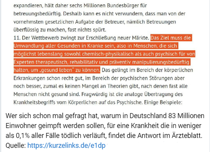 dem Menschen zu erzählen, daß die Selbstreinigungsprogramme des Körpers Krankheiten wären, welche pharmazeutische Gifte benötigen, um sie zu behandeln. |