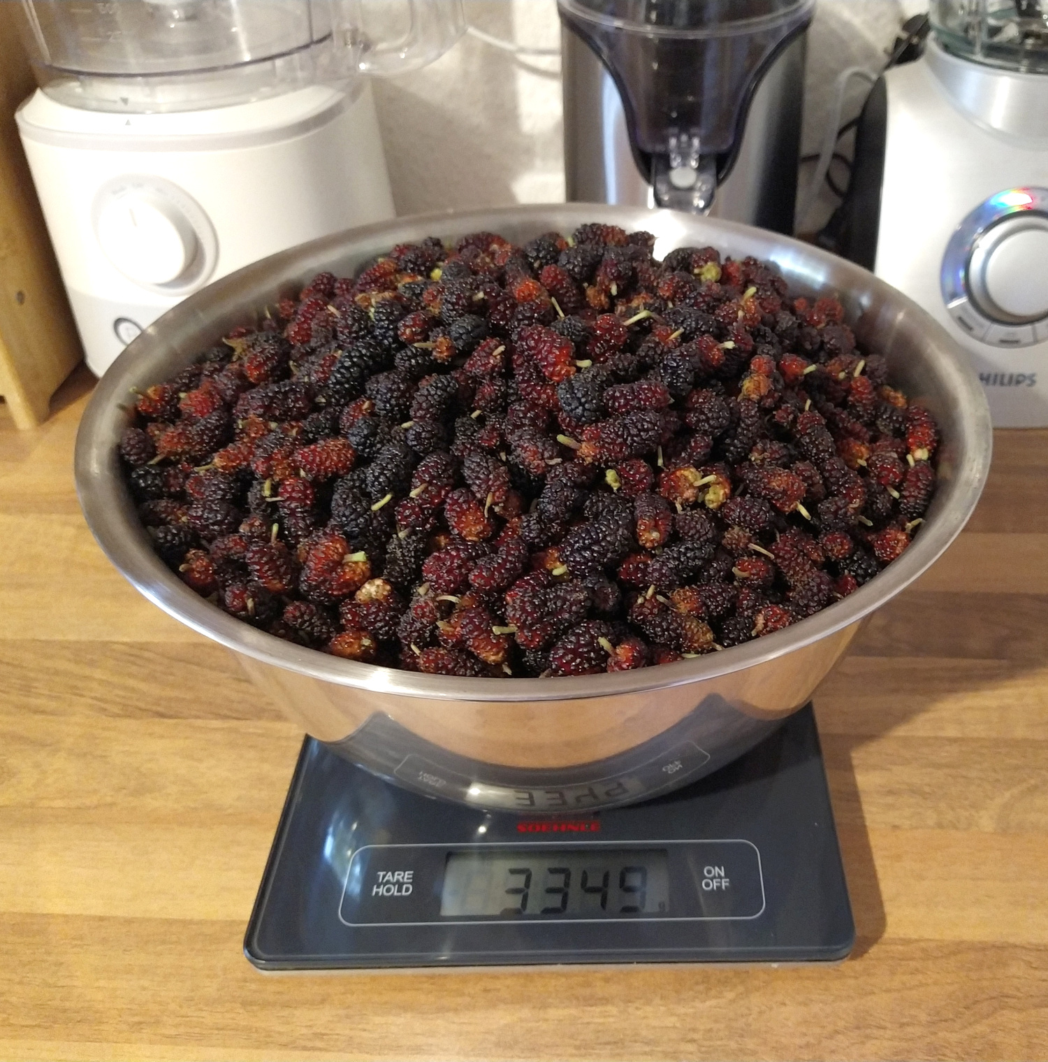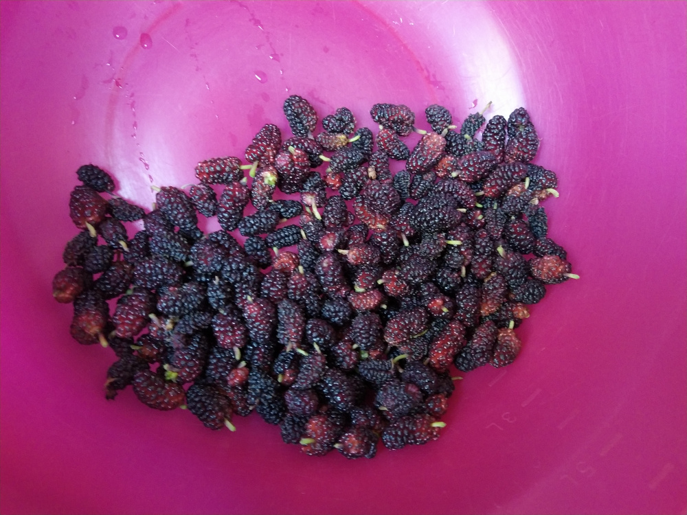 Denn abends lagen eine Menge Maulbeeren darauf, als hätte der Baum sich aufgefordert gefühlt etwas abzuwerfen.