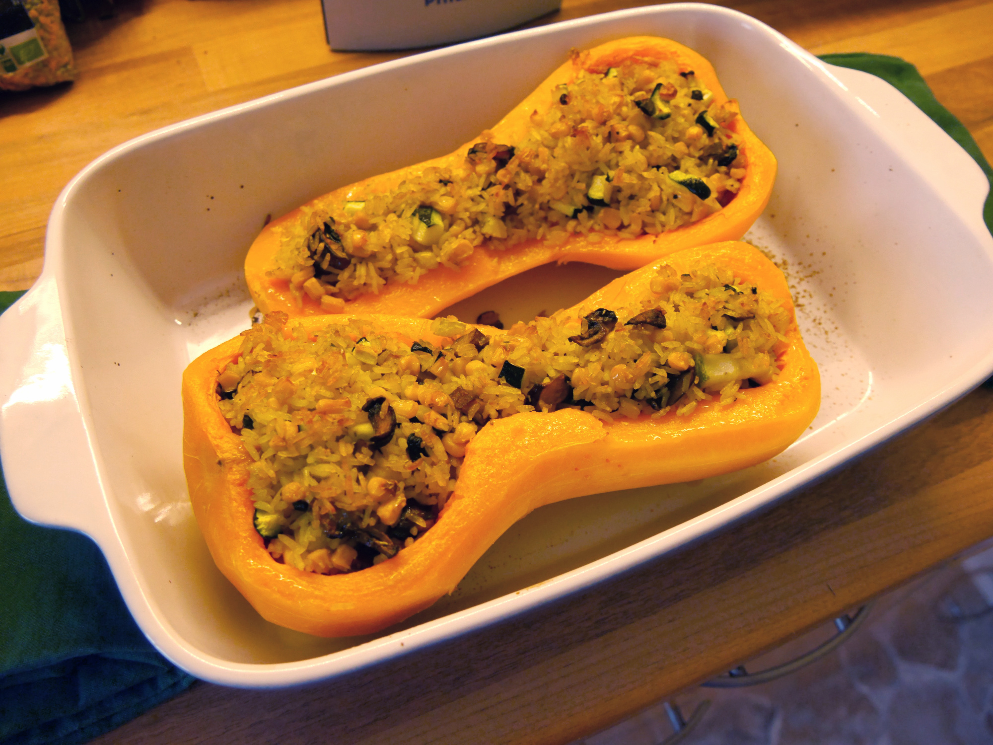 Wir haben ihn geschält und mit Reis und Gemüse befüllt verputzt.