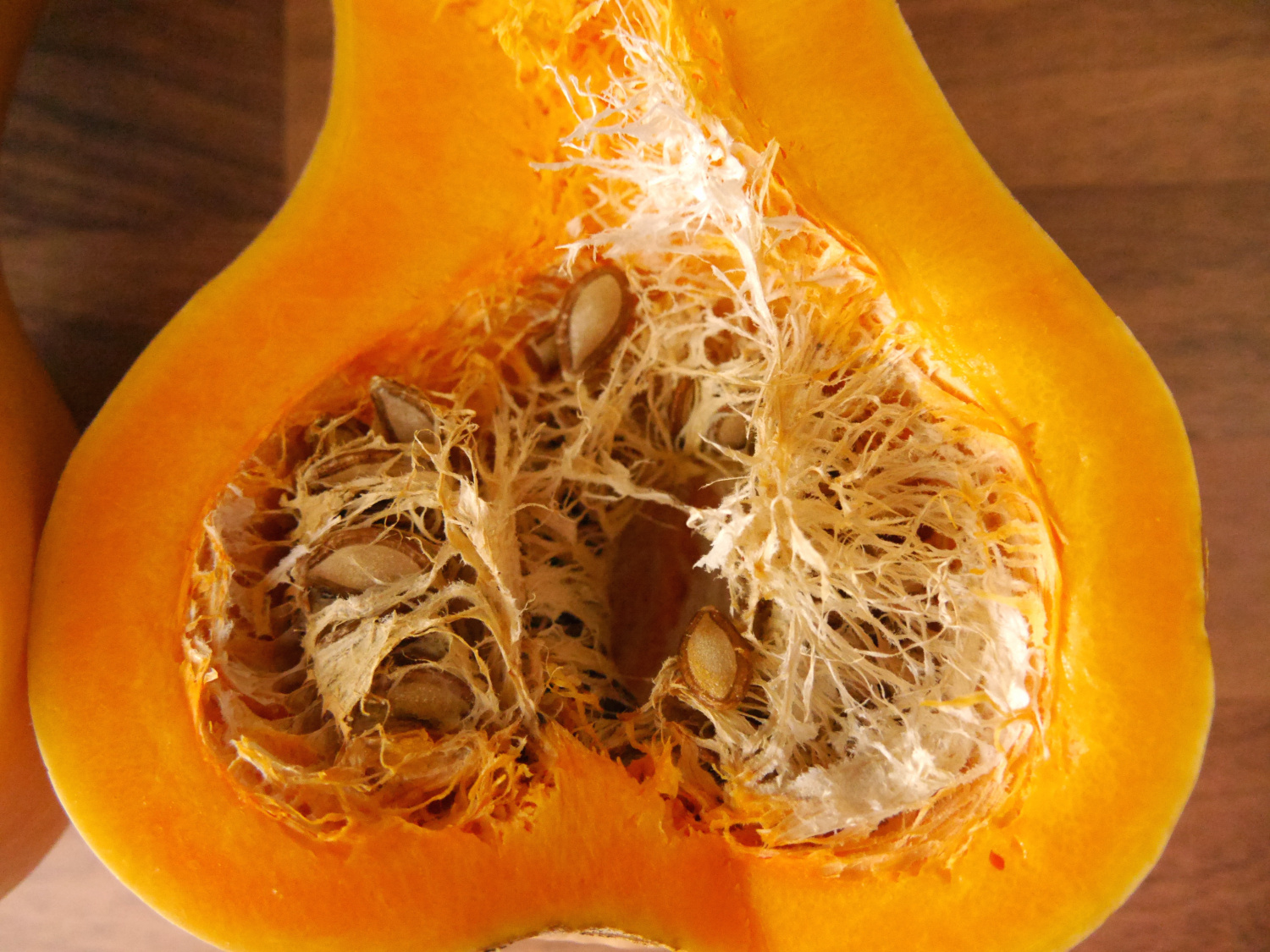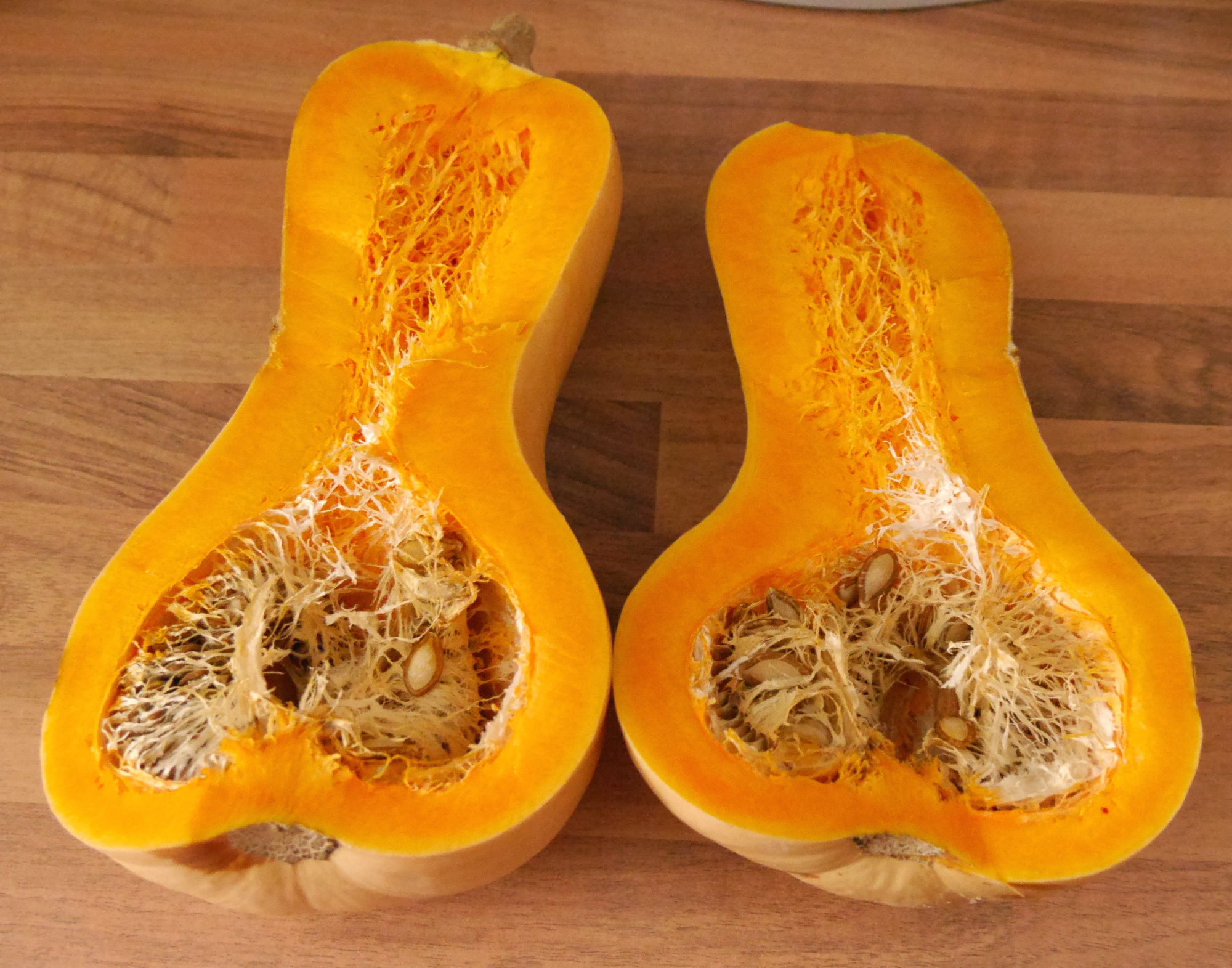 Schaut euch das an, liebe Freunde! Dies ist das Innere eines Butternut-Kürbis! Und zwar einer aus dem Hause Domsühl von unserer lieben Munin.  Herz