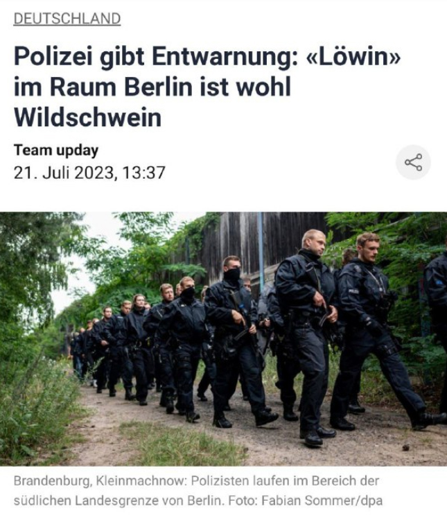 Der Wildschweinlöwe - Dancred - 21.07.12023 Was für ein Quatsch!!! Und deswwegen läuft den ganzen Tag schon eine Sonderberichterstattung zu diesem Thema auf allen Nachrichtenkanälen. Wirklich Sommerloch, wie jemand hier schon sagte. Dann kann die Polizei die Ausgangssperre ja wieder aufheben, mit welcher sie Bewohner der Gegend warnen wollte. Also wie schnell heute Ausgangssperren und vor allem wegen was verhängt werden ...