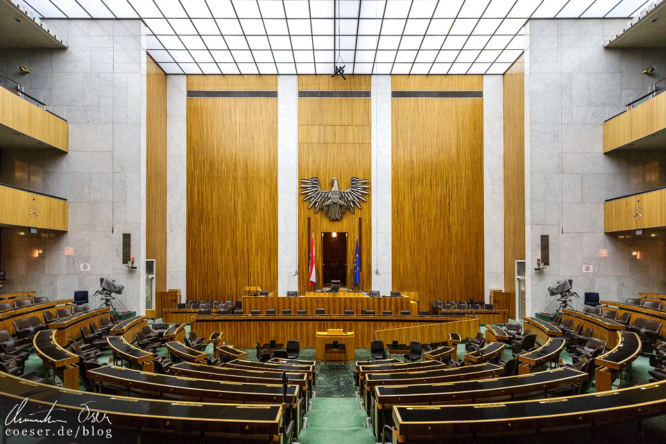 Doch die gute Nachricht zum Schluss. Mir war dies selbst nicht bewusst, doch es gibt noch einen 2. Saal im Parlament, der aber seltener im Einsatz ist: Der historische Sitzungssaal des Abgeordnetenhauses. Dieser weist große Ähnlichkeiten mit dem im Krieg zerstörten Saal des Nationalrats auf und ist für Besucher ebenfalls zugänglich: