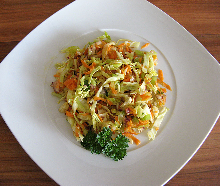 1. Karotte schälen und grob raspeln. Zwiebel schälen und kleinhacken, vom Straudensellerie die Fäden entfernen, und Sellerie und Weißkohl in dünne Scheiben schneiden. Alle Zutaten gut duchmischen.