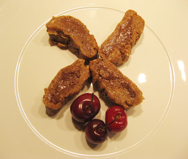 Die Mandeln und die Weizenkörner feinmahlen und vermischen. Honig, Wasser und Öl dazugeben, und alles zu einem geschmeidigen Teig verarbeiten. Kleine Bällchen formen, plattdrücken und bei 41° Grad zirka 1/2 Stunde trocknen lassen.