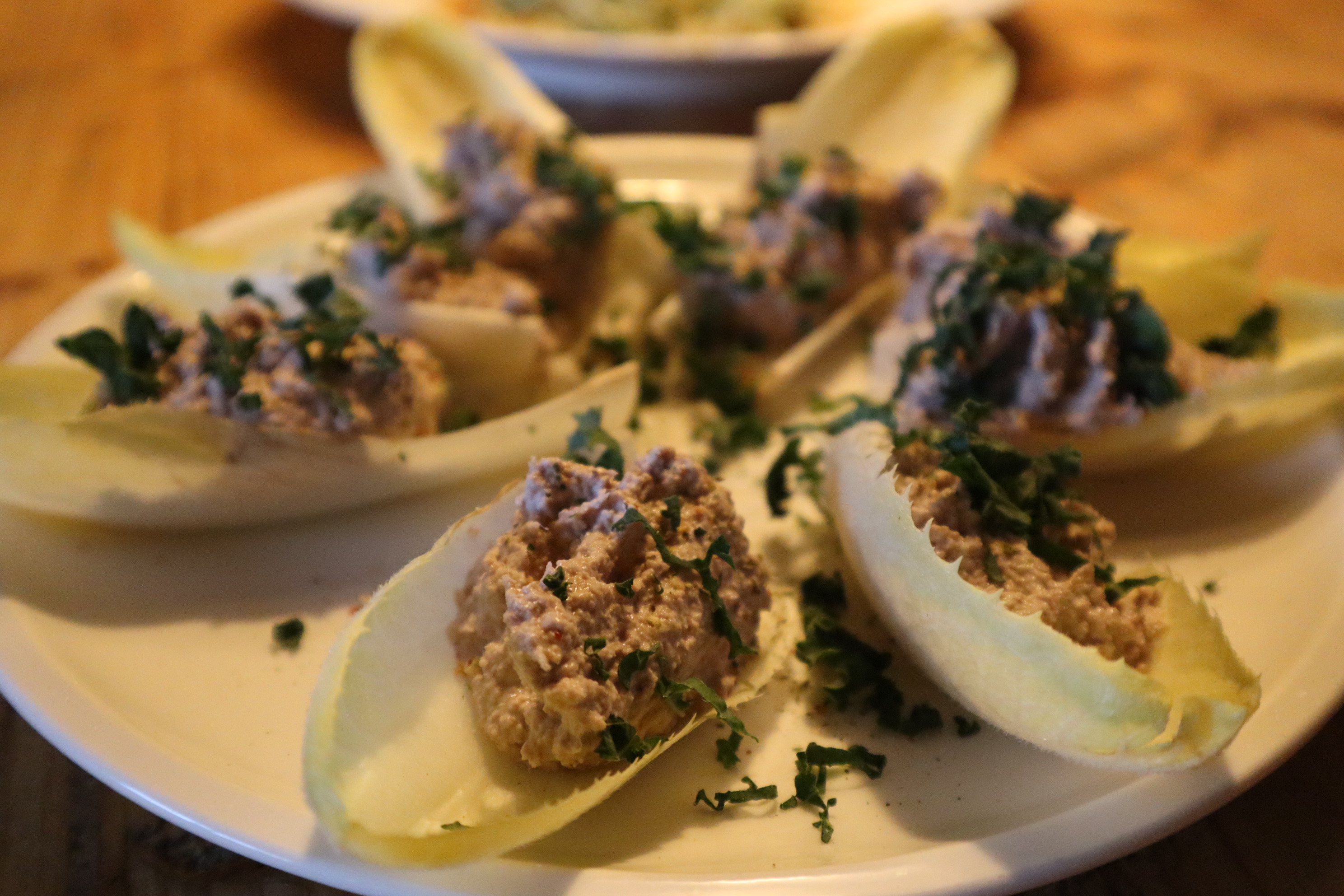 Einen Chicorée als Schiffchen auf den Teller, und auf jedes Blatt die Paste darauf geben. Mit Petersilie bestreuen, ich habe auf dem Bild kleingehackten Grünkohl genommen und alles mit Pizzagewürz bestreut.