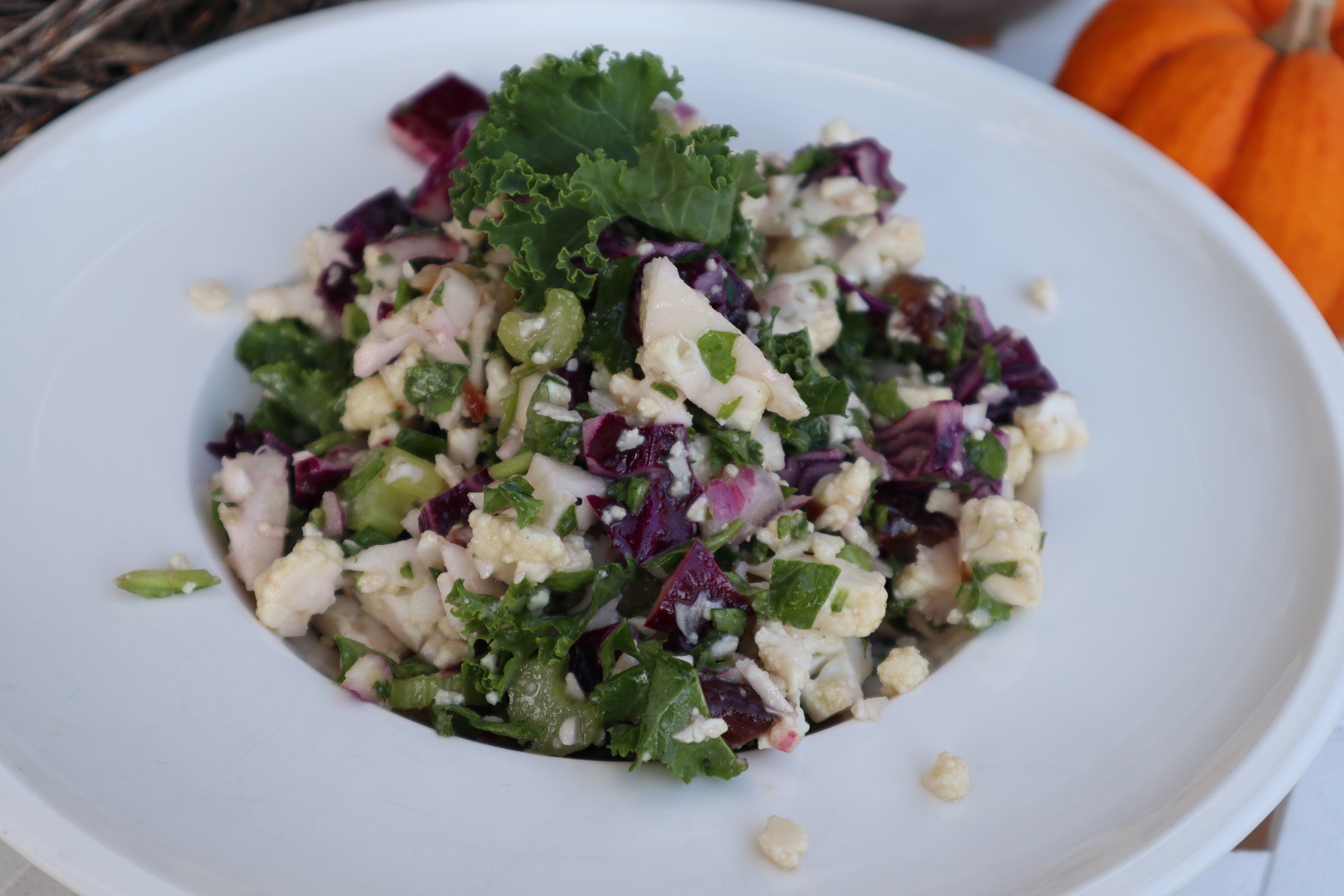 Über das Gemüse gießen, unterheben und mit Salz und Pfeffer abschmecken. Der Salat kann auch eine Weile noch ziehen, dann wird der Blumenkohl weicher.