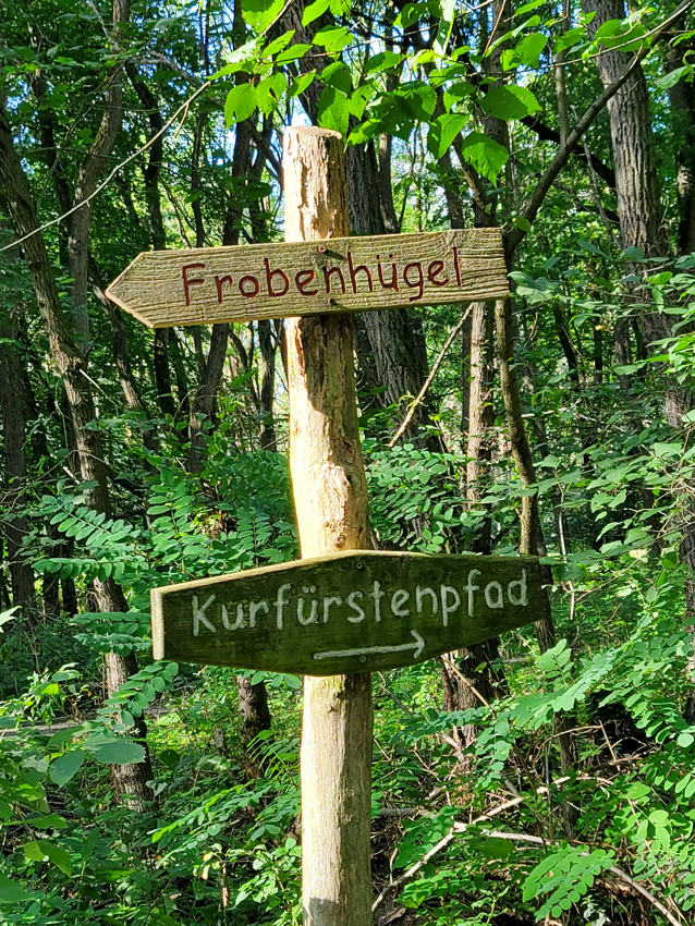 Wandert man den Kurfürstenpfad entlang, startend an der Siegessäule, kommt man kurz vor seinem Ende an einen Abzweig, bei dem rechts der Pfad weiterführt und es linker Hand zum Frobenhügel geht.