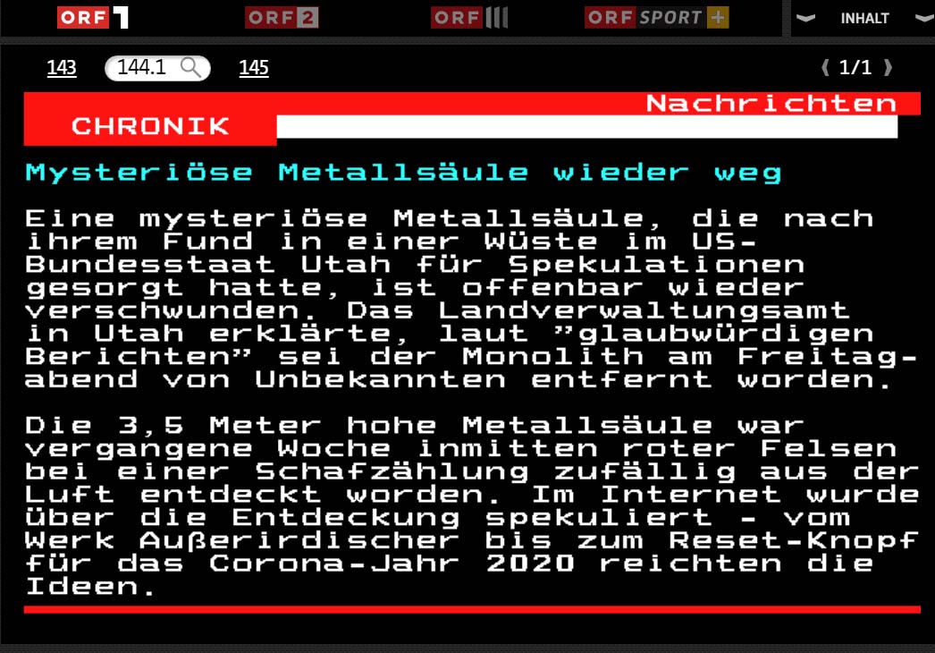 Die Entdeckung des ersten derartigen Monolithen Ende November in dem US-Bundesstaat Utah hatte zu wilden und nicht immer ernst gemeinten Spekulationen im Internet geführt. Weil die Metallsäule an den Monolithen aus dem Film „2001: Odyssee im Weltraum“ von Stanley Kubrick erinnerte, meinten Fans von Science-Fiction-Filmen, es handele sich bei der Metallsäule um ein Werk von Außerirdischen.