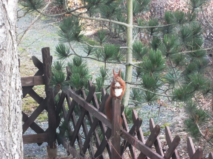 Als ich heute zu Hause so aus dem Fenster sah, begrüßte mich ein kleiner Freund, den ich schon des öfteren hier gesehen hatte. Meist nur aus sicherer Entfernung, und immer, wenn wir den Freund sehen, legen wir eine kleine Gabe in Form von ein paar Nüssen raus.