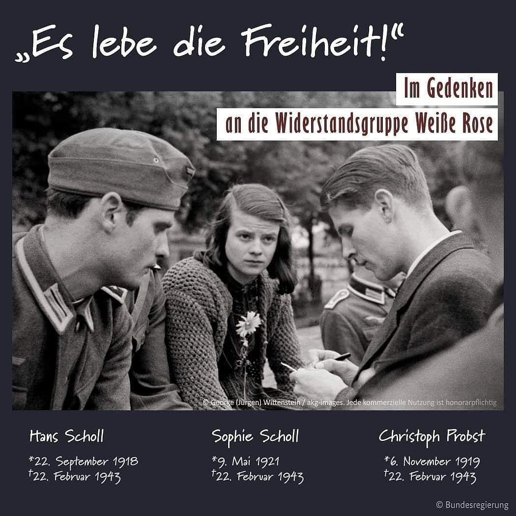 1942 Sie nimmt an der Universität München ein Biologie- und Philosophiestudium auf. Durch ihren in München Medizin studierenden Bruder kommt sie in Kontakt mit anderen Studenten, die sie in ihrer Ablehnung gegen den Nationalsozialismus bestärken. Entschlossen zur illegalen öffentlichen Kritik, beteiligt sie sich an der Verbreitung von Flugschriften der studentischen Widerstandsgruppe "Weiße Rose".