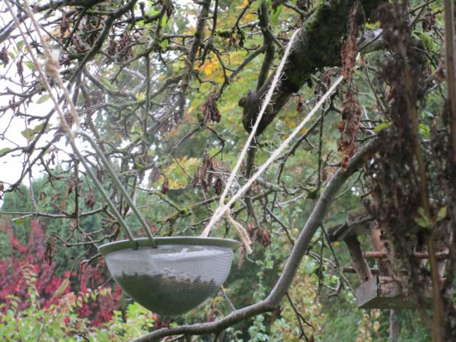 Und da verfiel ich jetzt auf den Gedanken, einfach ein altes Netzsieb zu nehmen. Das habe ich jetzt mal probehalber getan und habe es mit Schnüren in den Baum gehängt.