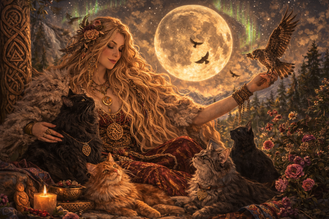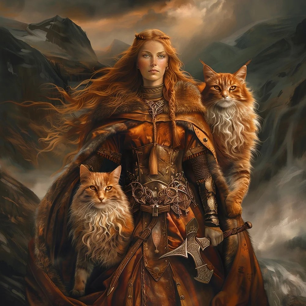 Die schöne und bezaubernde Freyja, eine Hauptgottheit des nordischen Pantheons, ist eine Göttin des Segens, der Liebe, der Lust und der Fruchtbarkeit. Als Mitglied des Wanen-Götterstammes teilt Freyja die Vorliebe ihres Volkes für die magischen Künste und der Wahrsagerei. Es ist Freyja, welche die Seidr-Kunst beherrscht. Seidr ist eine Form der Magie, die es den Praktizierenden ermöglicht, die Zukunft kennenzulernen und zu verändern. Als Anführerin der Wanen-Götter gilt Freyja als Völva, eine Praktizierende von Seidr, deren Kunst und Ritual Ereignisse erkennen kann, bevor sie stattfinden. Die Völva kann dann nämlich versuchen, diese Ereignisse zu ändern, Feinde in den Untergang zu führen und Freunde vor einer drohenden Katastrophe zu bewahren. Freyja läßt sich im Palast von Sessrúmnir (Sitzzimmer) nieder, der auf dem Grund des Fólkvangr (Volkshalle, Volkshof, Volksfeld) steht, wo die Hälfte der im Kampf getöteten Helden die Ewigkeit verbrachte; die andere Hälfte ging in Odins Halle, Walhalla. Der neunte Saal ist Folkvangr, wo Freyja verfügt. Wer soll im Saal Platz nehmen? Die Hälfte der Toten wählt sie jeden Tag, Und die andere Hälfte hat Odin. Obwohl Freyja normalerweise keine Kriegswaffen trägt, besitzt sie viele Ausrüstungsgegenstände anderer Art. Ein solcher Gegenstand ist ein Umhang aus Falkenfedern, der jedem, der ihn trägt, das Geschenk des Fliegens macht. Wenn sie es nicht selbst trägt, leiht Freyja ihren Umhang an Gefährten und Mitarbeiter aus, die sich zuvor bereit erklären, ihren Befehlen Folge zu leisten. Freyjas wertvollster Besitz ist jedoch die Halskette oder der Torc, bekannt als Brísingamen (glänzender Torc oder bernsteinfarbener Torc). Brísingamen wurde von Zwergen hergestellt und zu einem hohen Preis gekauft. Freyja bewacht ihre Halskette mit der allerhöchsten Aufmerksamkeit. Zusätzlich zu ihrem Umhang und dem glänzenden Torc reitet Freyja auf einem glitzernden Streitwagen, der von zwei Hauskatzen gezogen wird. Außerdem wird sie dabei von ihrem Totemtier begleitet, einem Schwein namens Hildisvíni. Einer ihrer gebräuchlichen Beinamen, Sýr (sow, Sau) entsteht auf diese Weise. Freitag, der 13. ist der Tag, der Göttin Freyja!