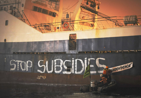 In der Kälte eines frühen Oktobermorgens statten Aktivisten von Bord des Greenpeace-Schiffes “Arctic Sunrise” der Tiefsee-Fangflotte im Hafen von Vigo, Spanien, einen Besuch ab. In riesigen Lettern schreiben sie "Stoppt die EU-Subventionen" auf die Schiffswände derjenigen Trawler, die in vielen hundert Metern Wassertiefe die Lebensräume zerstören.