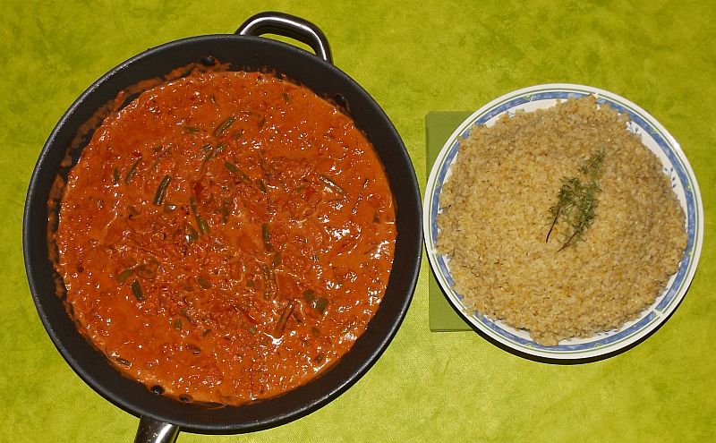 Währenddessen Wasser aufkochen. Den Bulgur reingeben, 5 min. kochen und dann zugedeckt ziehen lassen.