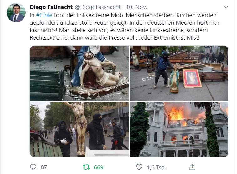 Auch in Chile brennen die Kirchen, und es wird gestohlen. Hier werden zur Abwechslung mal die chr**stlichen Heiligenbilder und Kruzifixe in Zerstörungswut auf die Straße geworfen und angezündet. Die Katholiken haben im Moment also alle Hände voll zu tun.