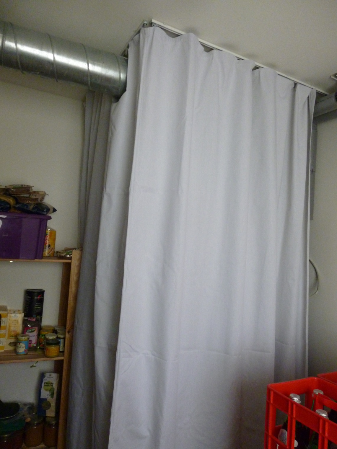 Und da in unserem Hauswirtschaftsraum jeder Quadratzentimeter genutzt wird, sollte ein Abschirmvorhang die Heizung einhüllen.