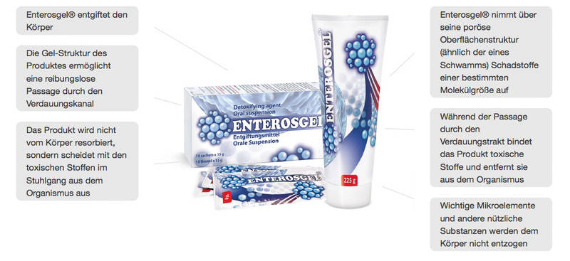 Zitat:Unerwünschte Mikroorganismen in Lebensmitteln und Getränken können Erreger von Darminfektionen, Durchfall und Vergiftungen sein. Darminfektionen machen sich am häufigsten durch Durchfall, Erbrechen, Bauchschmerzen, Krämpfe, Übelkeit, Appetitlosigkeit und Fieber bemerkbar. Eine typische Situation ist der Reisedurchfall aufgrund einer anderen Klimazone und fremdländischer Küche oder subjektiv stark veränderter Trink- und Essgewohnheiten während der Reise. Die Einnahme von Enterosgel® eignet sich hier ausgezeichnet zur Behandlung solcher alimentärer Infektionen (Bezeichnung für die Aufnahme von Erregern über die Nahrung).