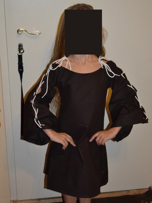 Das Kleid habe ich selber entworfen, dazu habe ich für den oberen Teil einfach die Maße von einem normalen – nicht eng anliegenden – Nicki genommen. Also einmal rundum gezeichnet und die Ärmel verlängert sowie nach untenhin einfach die Länge und die Weite bestimmt. Die Ärmel habe ich dann oben in der Mitte aufgeschnitten, vernäht und mit Ösen versehen, um die Schnürung mit einzuarbeiten. So bekommt es auch einen Hauch von einem mittelalterlichen Kleid. Kann auch sehr gut als Überkleid getragen werden.