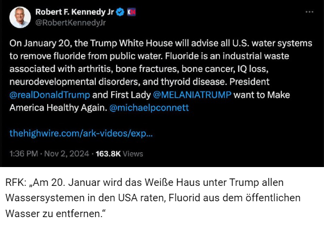 "Am 20. Januar wird das Weiße Haus von Trump alle Wasserversorgungssysteme in den USA anweisen, Fluorid aus dem öffentlichen Wasser zu entfernen. Fluorid ist ein Industrieabfall, der mit Arthritis, Knochenbrüchen, Knochenkrebs, IQ-Verlust, neurologischen Entwicklungsstörungen und Schilddrüsenerkrankungen in Verbindung gebracht wird." Das ist zumindest mal eine sehr konkrete Ansage.