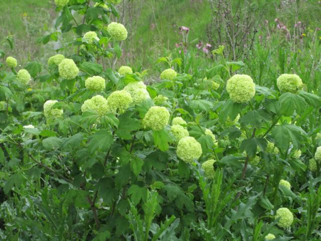 Und das ist der "gefüllte Schneeball", in früher Blüte ist er grünlich, was ich schon besonders finde. Es ist tatsächlich eine einheimische Pflanze, habe ich fast nicht erwartet. Hübsch ist sie ja schon, aber diese Sorte bildet keine Früchte aus, habe ich gelesen, das ist schon schade, sollte das stimmen, und der gemeine Schneeball wäre dann die bessere Wahl gewesen. Ich werde im Herbst mal wieder da hingehen und nachschauen, ob Früchte dran sind. Das steht hier vor nahezu jedem Gebäude dort, die hatten wohl alle den gleichen Gärtner.