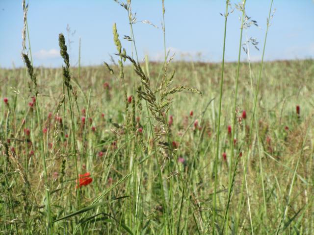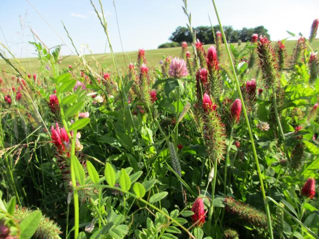 Inkarnat-Klee oder Rosenklee. Ganze Felder sind dieses Jahr hier damit bestellt. Inkarnat-Klee ist Gründünger. Die Felder ziehen sich hier zur Zeit bis zum Horizont - und darüber hinaus.