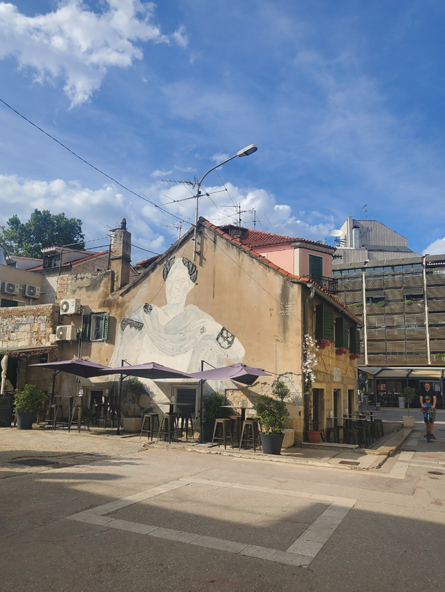 Wandmalerei des Kaisers Diokletian an einem Giebel eines Restaurants unweit des Palastes