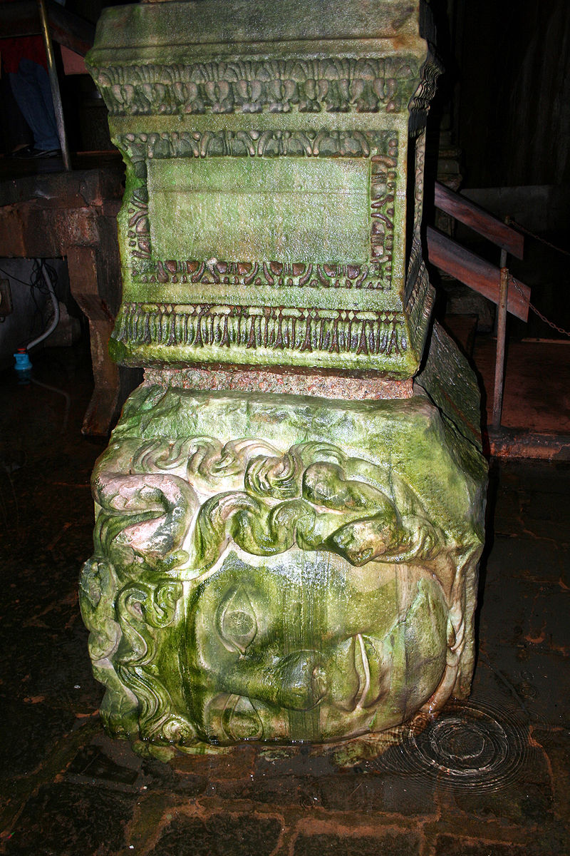 Ein umgedrehtes Medusenhaupt als Säulenbasis in der Zisterne.