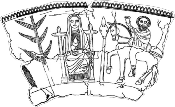 Hier sieht man die Priesterin Pogezana und den anreisenden Missionar, Brun von Querfurt (974-1009 n. d. Z.) auf einer frühmittelalterlichen Darstellung. Für Tobias wahrscheinlich nur eine Frau auf einem repräsentativen Stuhl, die einen Mann auf dem Pferd erwartet.