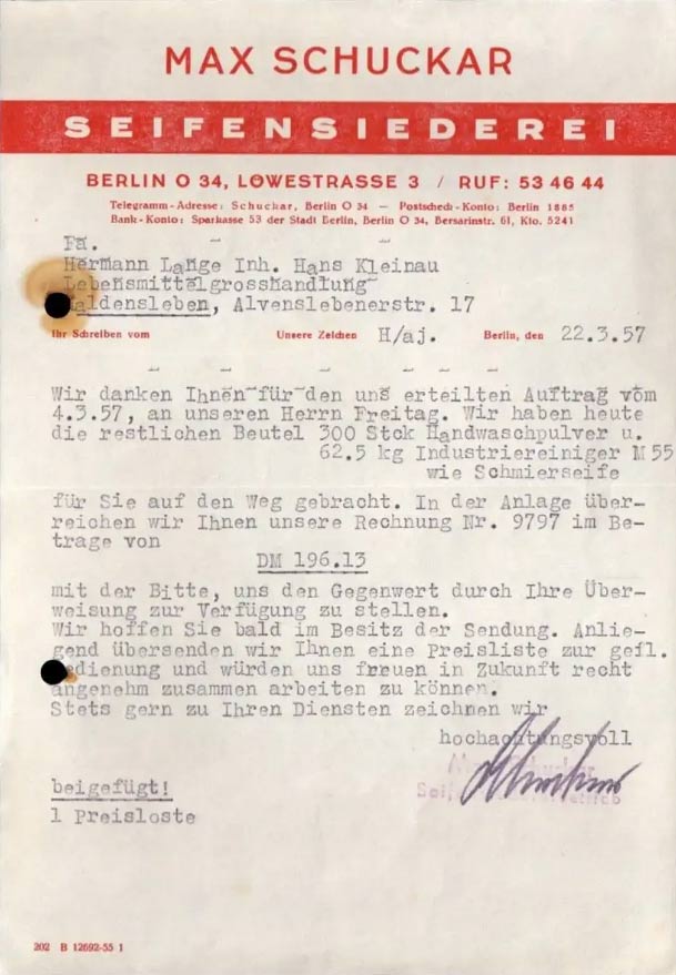Folgend zwei offizielle Geschäftsbriefe, die mit Schreibmaschine verfaßt wurden. Beide Briefe stammen aus den 1950ern und sind mit rechtsbündiger Unterschrift versehen. Einer aus New York, einer aus Deutschland.