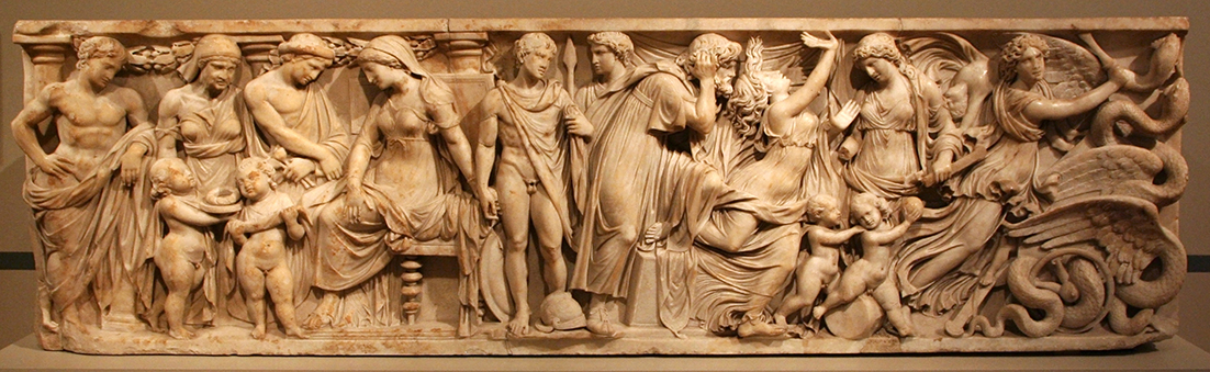 Medeas Taten in Korinth auf einem römischen Sarkophag des 2. Jahrhunderts, Altes Museum, Berlin (im Louvre ist eine bildliche Darstellung des Reliefs ebenfalls vorhanden sowie sehr viele antike Kunstschätze, Büsten und Statuen).