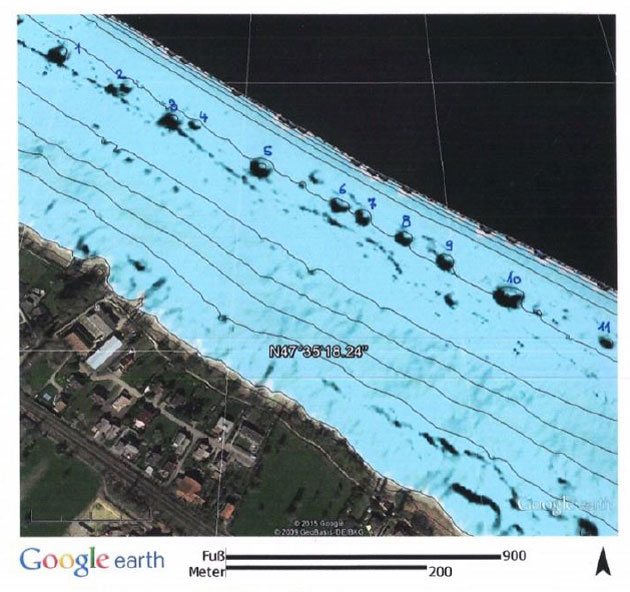 Entdeckt wurden die Hügel, die rund viereinhalb Meter tief im Wasser und in regelmäßigen Abständen in einer Reihe stehen, eher zufällig. Im Auftrag der Internationalen Gewässerschutzkommission für den Bodensee hatte ein Forscherteam aus Deutschland, Österreich und der Schweiz den Bodensee neu vermessen – ein Forschungsschiff tastete 2015 mithilfe eines Fächerecholots den Seegrund ab. Bei der Auswertung der Daten fielen die Erhebungen dem Wissenschaftler Martin Wessels vom Institut für Seenforschung in Langenargen auf. "Wir dachten ursprünglich, dass das Störungen bei den Messungen sind", sagt er. Aber als das Team erneut nachgemessen hatte, stellte sich heraus, dass es sich um echte Strukturen handelte.