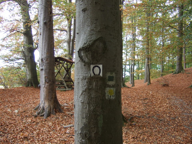 Direkt an einem Baum sah ich einen Wegweiser mit Hufeisensymbol, ich war hier offenbar richtig.