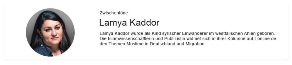 Auf T-online gibt es aber noch andere feine Kolumnisten außer dem feinen Florian Harms. Kolumnistin für T-online ist unter anderem auch Lamya Kaddor, die sich auch als „Islamwissenschaftlerin“ ausgibt, in Wahrheit aber wohl eher eine Islamlehrerin ist, wie Tomas Spahn auf Tichys Einblick sehr schön herausarbeitete.