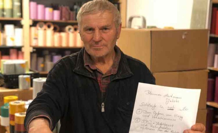 Kranzschleifen-Drucker Heinz-Jürgen Jahnke (70) zeigt zum Beweis das Fax der Blumenhändlerin: „Wir haben am 12. November den Auftrag per Fax bekommen. Alles war klar und deutlich geschrieben und leserlich. Ich drucke das, was der Kunde uns per Fax zuschickt.“