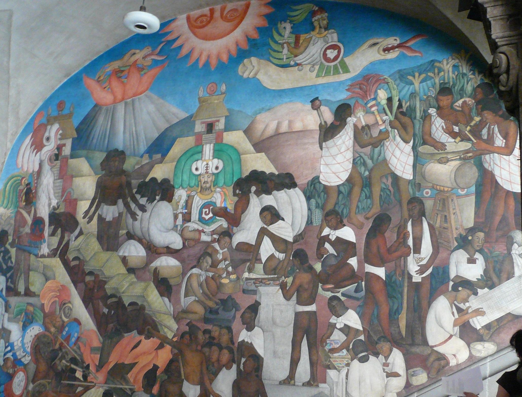 Der legendäre Priestergott Kukulkan / Quetzalcoatl im Zentrum des Bildes. Der hellhäutige, bärtige G*tt sitzt unter einem Tempel, den eine Sonne mit umgedrehtem Gesicht bescheint und die so die Zerstörung der indigenen Welt ankündigt. Im oberen Bereich des Bildes erkennt der Betrachter den Aufbruch des friedliebenden Gottes auf einer Barke, der nach einem Verrat sein Volk verlassen mußte und sich schließlich in den Stern Venus verwandelte. Die Szene soll gleichzeitig an seine mythologische Prophezeiung erinnern, eines Tages zurückkehren zu wollen, um der Menschheit Errettung und Wohlstand zu bringen. So zerstörte der Fall Quetzalcoatls die ursprüngliche Ordnung, und soziale Ungerechtigkeit kam auf, was den Übergang von der Mythologie zur Geschichte markiert. Mit diesem Bruch begannen in den Augen des Malers Diego Rivera die Unterdrückung des indigenen Volkes und der Widerstand gegen die Machthaber.