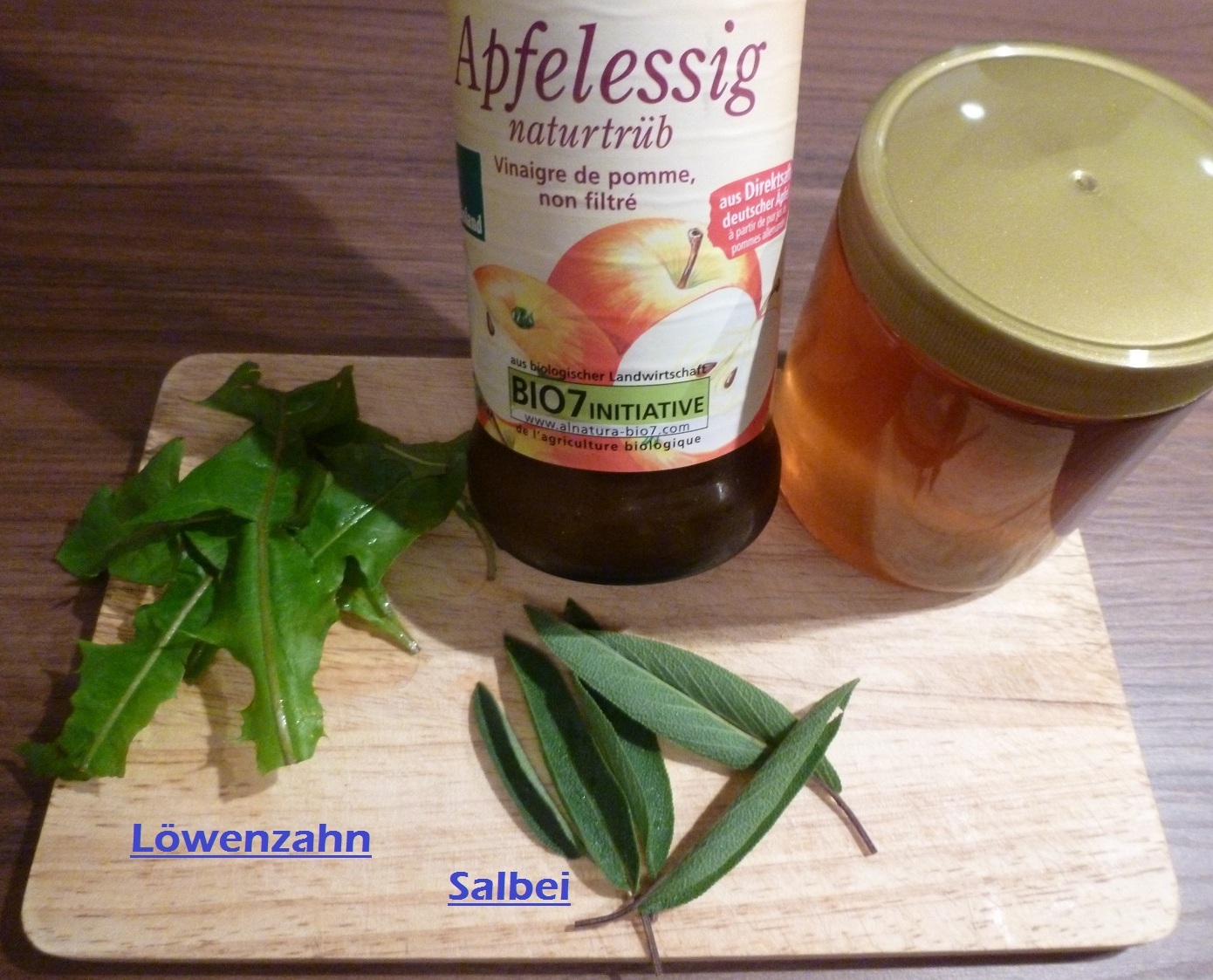 Nach drei Wochen kann die Kräuter-Essigmischung abgeseiht werden. Die Bitterstoffe vom Löwenzahn sind sehr gut in den Apfelessig übergegangen. Dann kommt noch der gewünschte Honig hinzu, und noch ein bis zwei Tage stehenlassen, bis der Honig sich komplett aufgelöst hat.