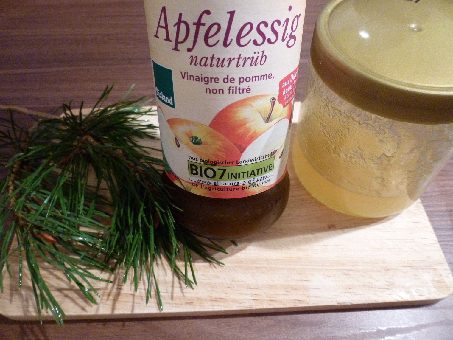 Die Nadeln klein schneiden und in ein Einwegglas mit Gummiring geben. Die Nadeln mit dem Apfelessig übergießen und an einem hellen, aber nicht vollsonnigen Platz stellen.