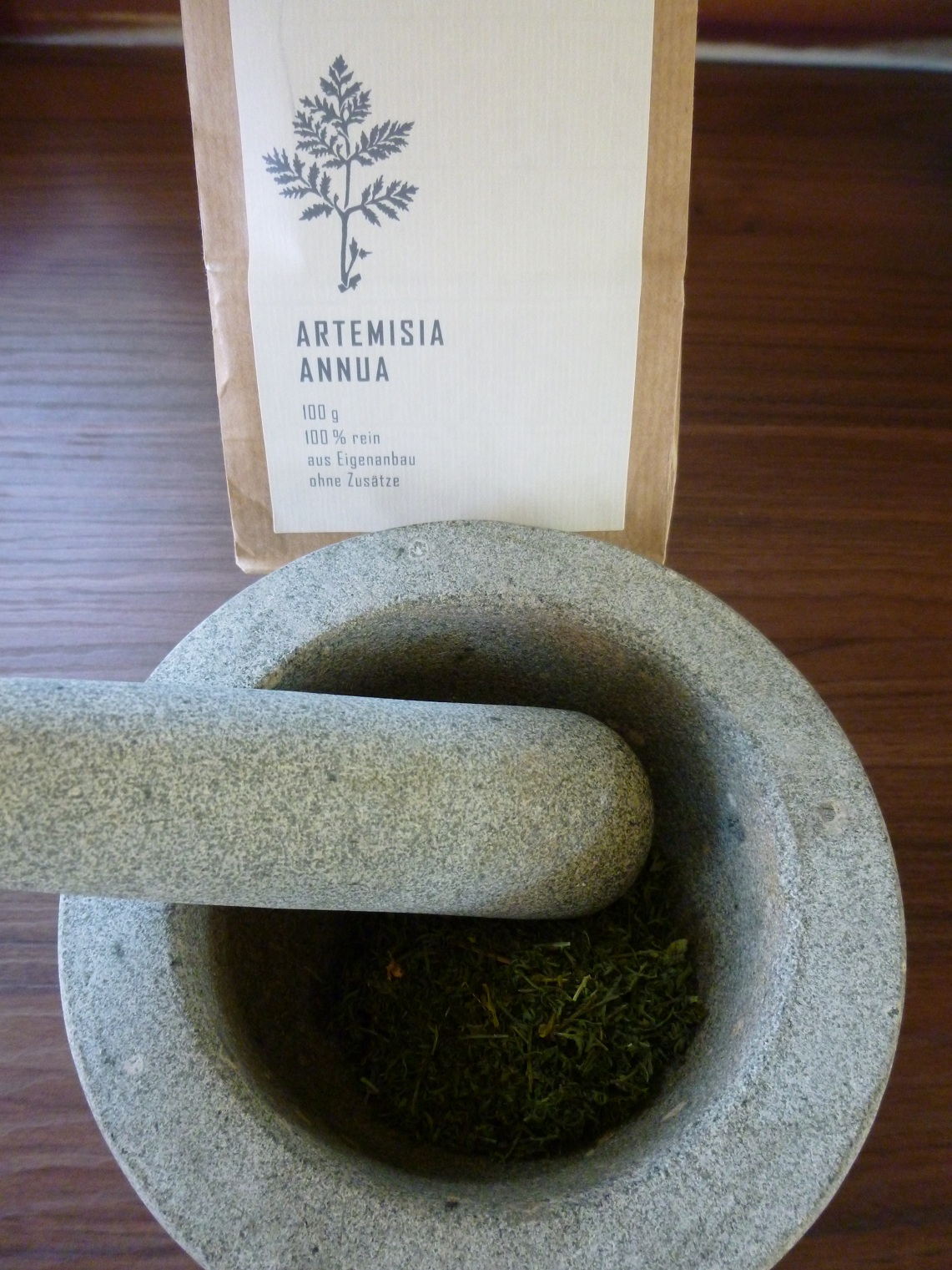 Um das Kraut mittrinken zu können, habe ich es in einem Steinmörser pulverisiert.