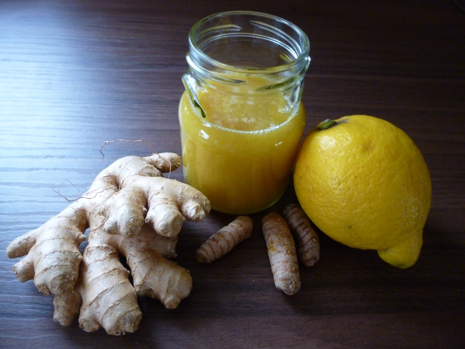 Zitrone schälen, Ingwer und Kurkuma durchschneiden. Alle Zutaten in ein Glas geben und mit einem Stabmixer zerkleinern.