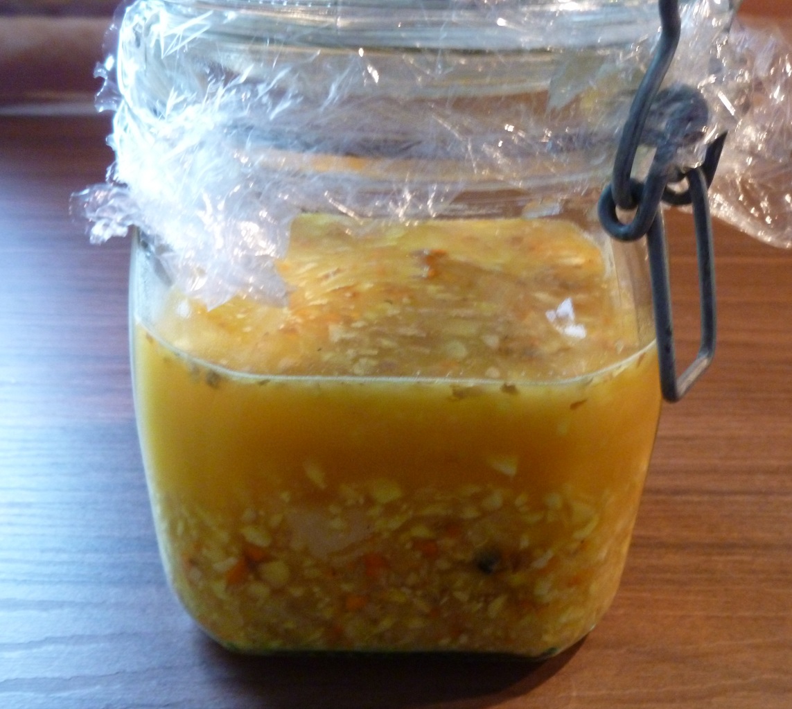 Das Oxymel für 1 Woche in den Kühlschrank stellen und täglich umrühren. Nach der Woche alles durch ein Sieb geben und das Oxymel in einem Glas auffangen.