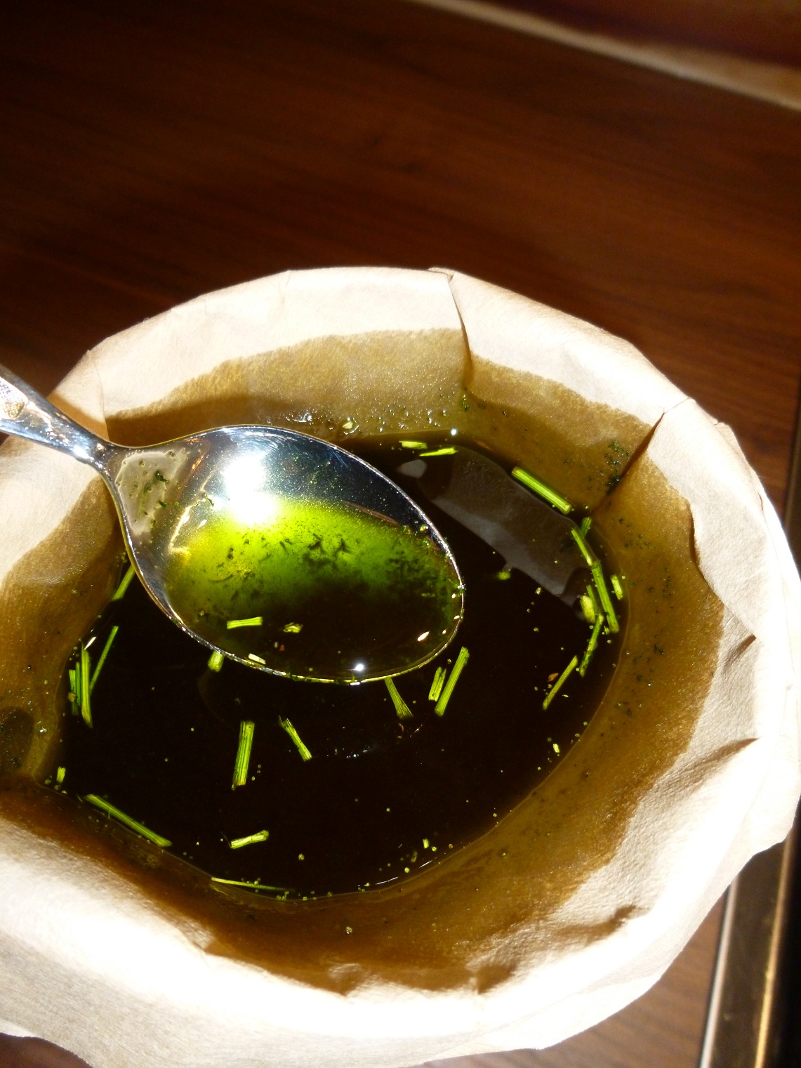 Nach 1-2 Stunden hat sich das Olivenöl grünlich verfärbt. Seihen Sie das Öl-Pulvergemisch durch das Leinentuch in einen Messbecher. Hilfreich ist ein Sieb auf dem Messbecher, hier kann das Leinentuch hineingelegt werden. Wenn alles durchgelaufen ist, drücken Sie die übrig gebliebene Pulvermasse sorgfältig durch das Leinentuch aus, so dass dann nur noch fast trockene Restsubstanz übrig ist. Diese Reste können Sie jetzt wegwerfen.