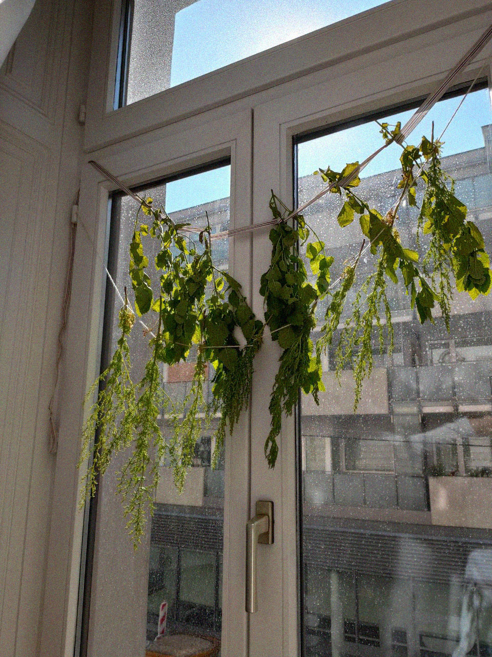 Am selben Tag haben wir sie gemeinsam mit ein paar Ästchen Zitronenmelisse zum Trocknen aufgehängt.