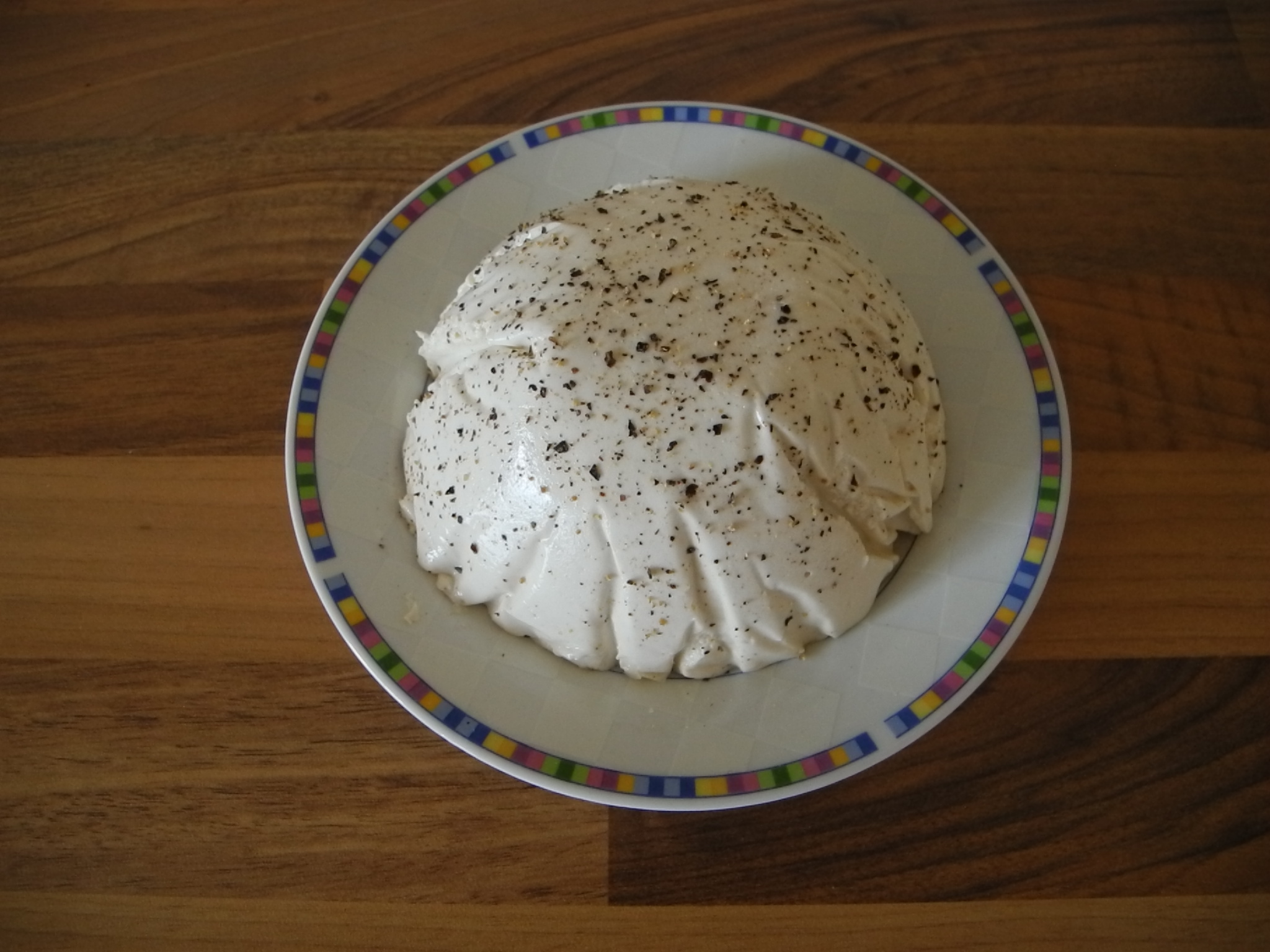 In meinem Fall habe ich eine Variante mit Pfeffer gemacht und eine mit Schnittlauch. Die Konsistenz bewegt sich zwischen Mozarella und Feta, je nach zugegebener Wassermenge. Ich finde, das Ergebnis kann sich sehen lassen.
