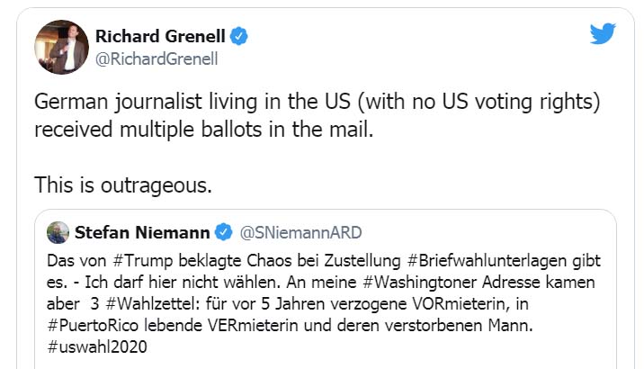 „German journalist living in the US (with no US voting rights) received multiple ballots in the mail. This is outrageous“, schrieb Grenell, der als Vertrauter von Donald Trump gilt.