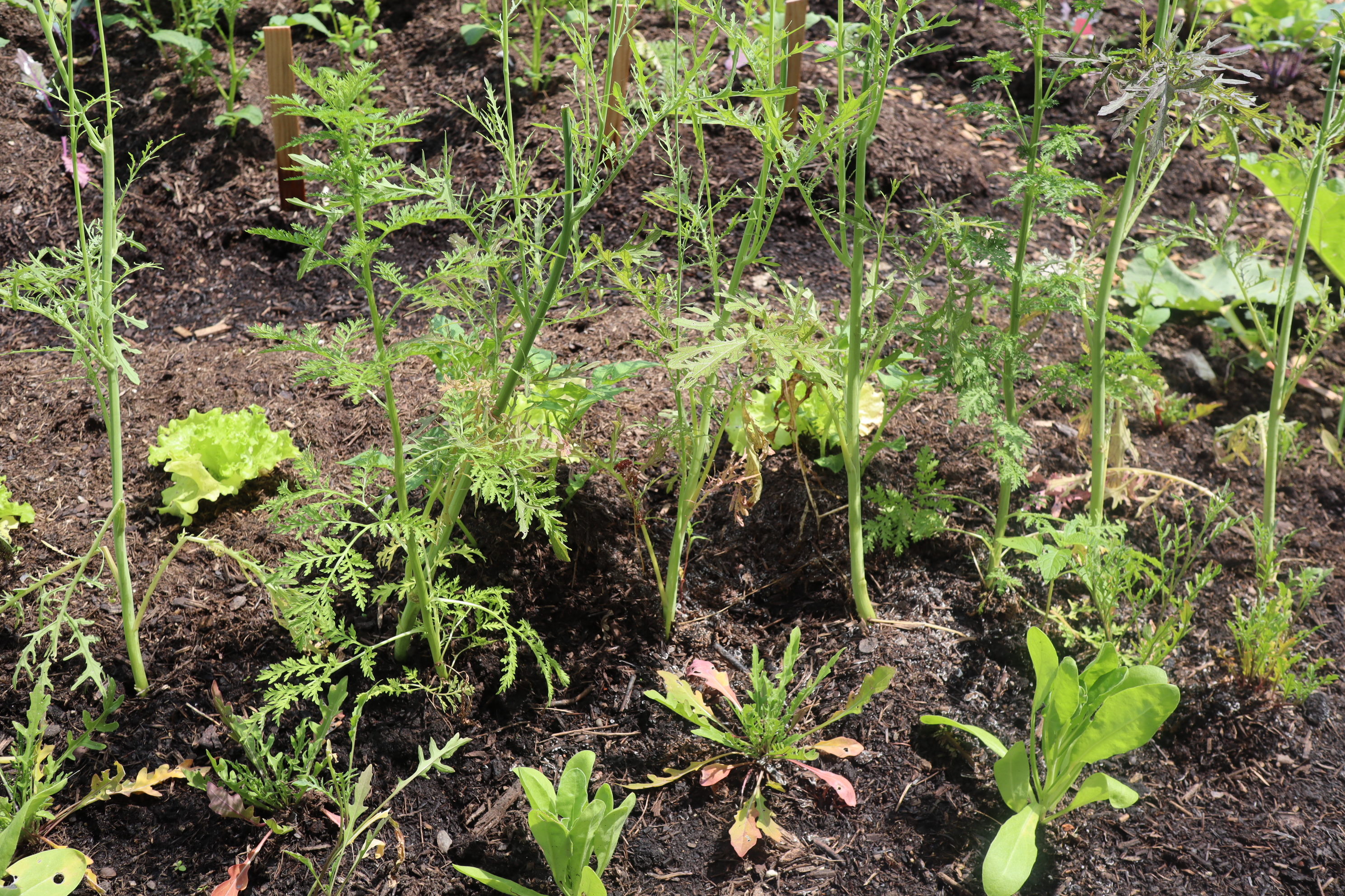 Ich habe auch Arte zu den Kartoffeln gepflanzt. Also eigentlich überall immer eine Pflanze zwischen dem Gemüse, im ganzen Gemüsegarten verteilt. Bisher scheint jedes Gemüse damit klar zu kommen. Die Kartoffeln wachsen sehr gut. Der in die Höhe geschossene Salat auf dem Bild ist weg, die Artemisia hat nun mehr Platz.