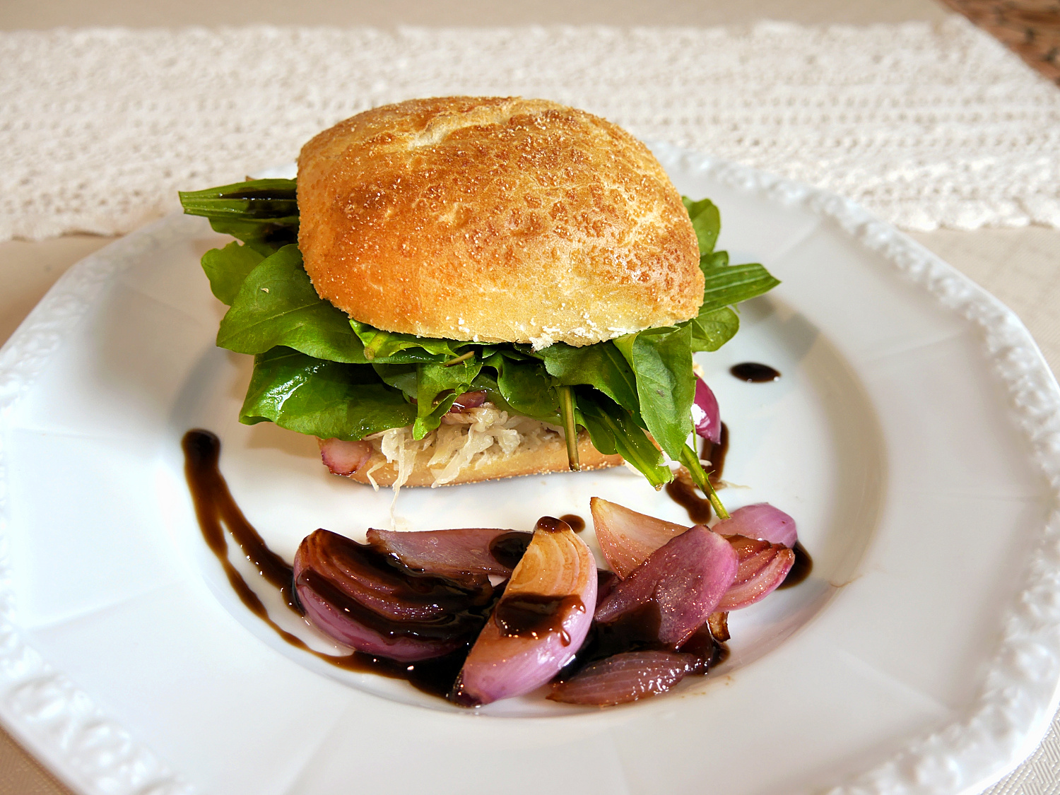 - Brötchen mit Streichfett betreichen, dann folgt die gebratene Zwiebel, etwas Sauerkraut (ohne Flüssigkeit, sonst weicht das Brötchen auf), frisch gemahlener Pfeffer, eine Menge Löwenzahn und obendrauf ein wenig Balsamico-Creme.
