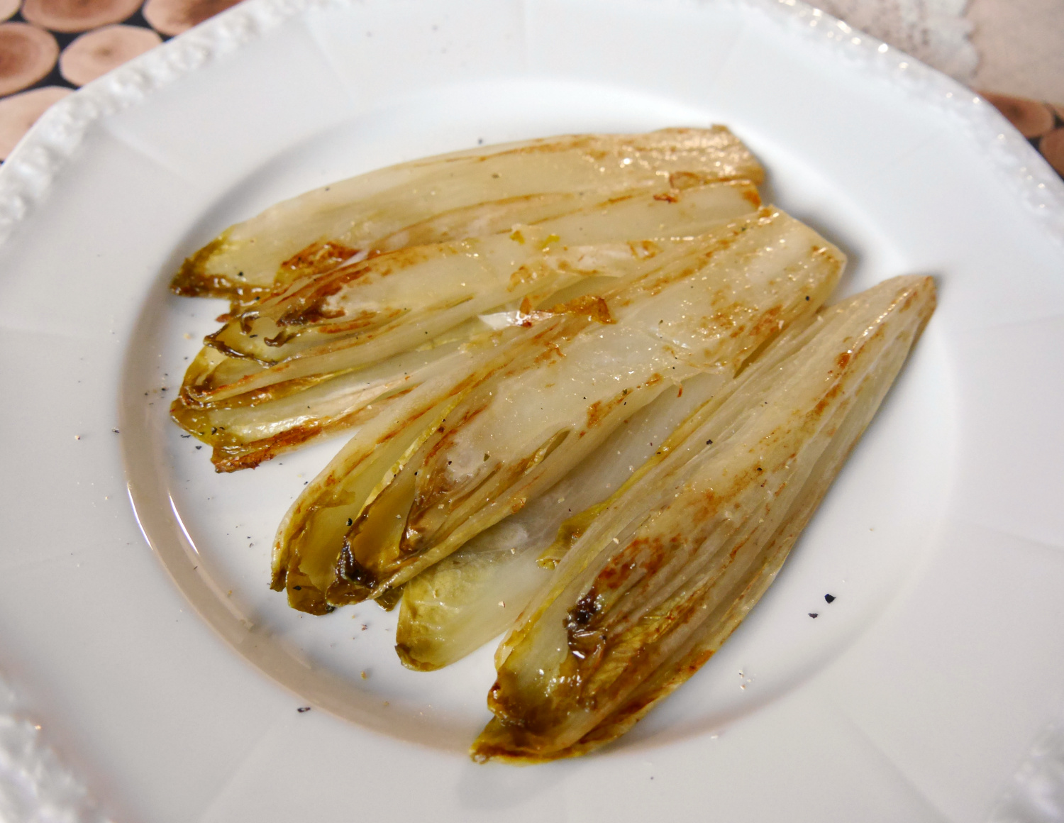 - Den Chicoree mit wenig Streichfett (z.B. Alsan) und etwas Wasser in eine Pfanne geben, leicht salzen und bei geschlossenem Deckel 5-10 Minuten brutscheln lassen, je nach gewünschter Konsistenz und Bitterkeit.